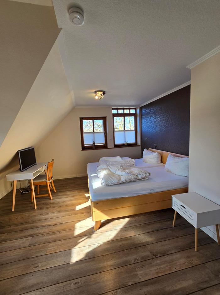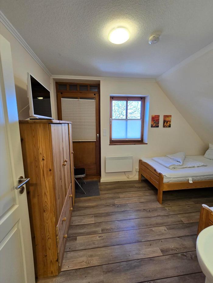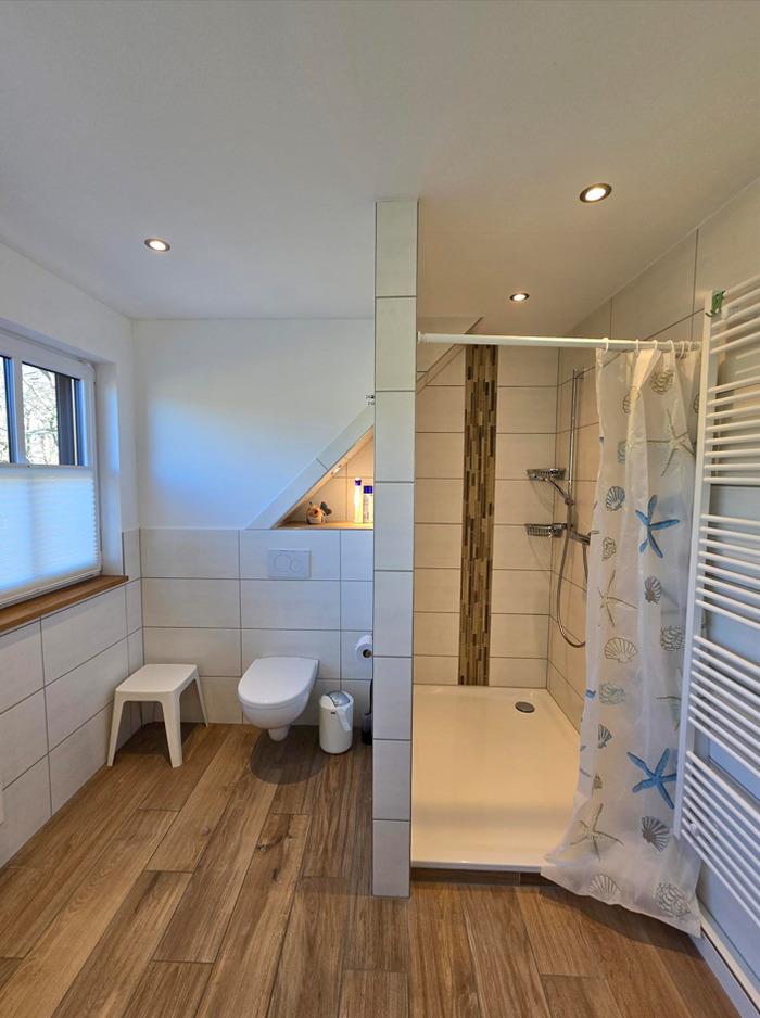 Im Obergeschoss ist das Duschbad, das große Elternschlafzimmer mit TV und mit einem Doppelbett und genügend Platz für ein Kinderbett.