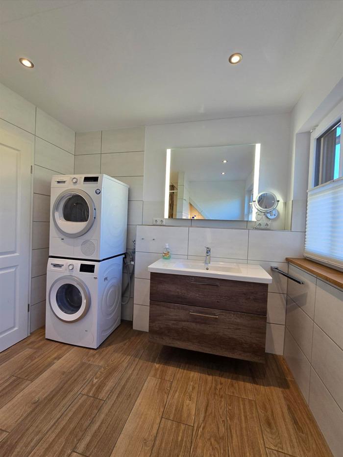 Im Erdgeschoß befindet sich ein Gäste-WC mit Waschmaschine und Trockner, ein Kinderzimmer mit Etagenbett, die vollwertig ausgestattete Küche und im großen Wohn-Esszimmer befindet sich der Kamin für gemütliche Abende, sowie der Ausgang zur Terrasse und in den Garten.
