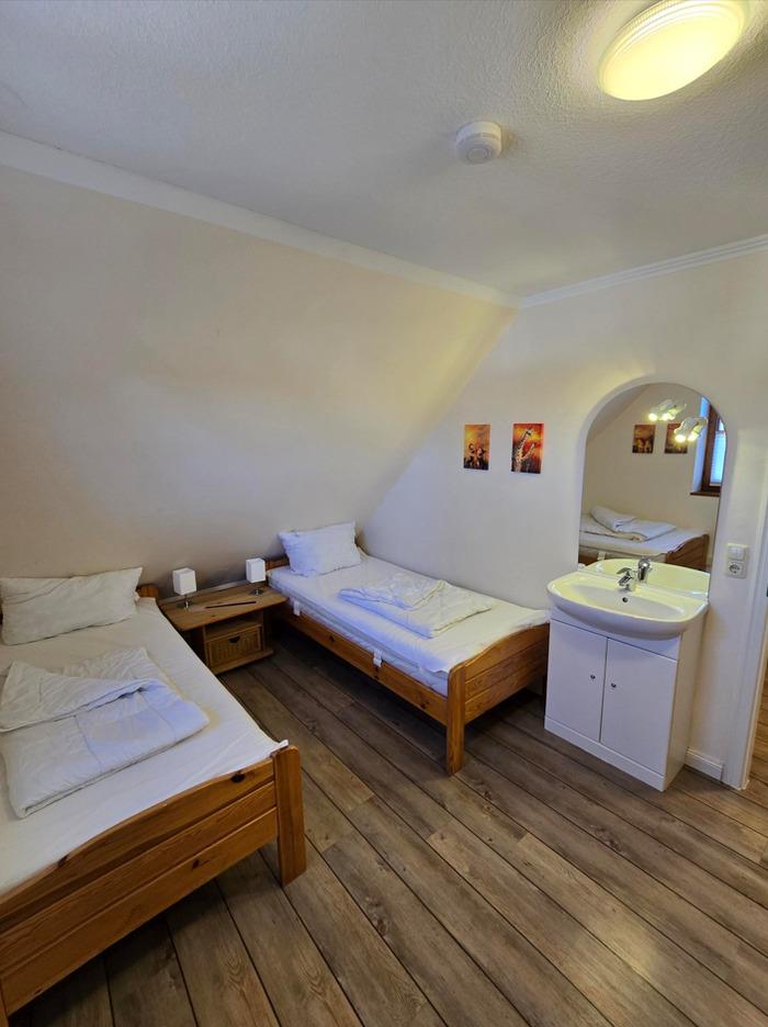 Das zweite Schlafzimmer mit zwei Einzelbetten , mit Fernseher und zusätzliches Waschbecken und Balkon.