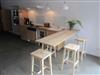 Einem Wohn-/Koch-/Ess-Bereich mit komplett ausgestatteter Küchenzeile, Kochinsel, Esstisch.
