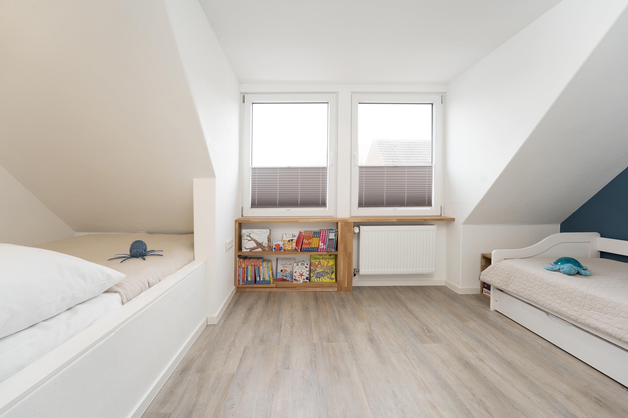 Schlafzimmer 3 (1. OG): 2 Einzelbetten (je 90x200 cm), Kleiderschrank, Verdunkelung: Plissee, (kein) Platz für ein Babybett vorhanden