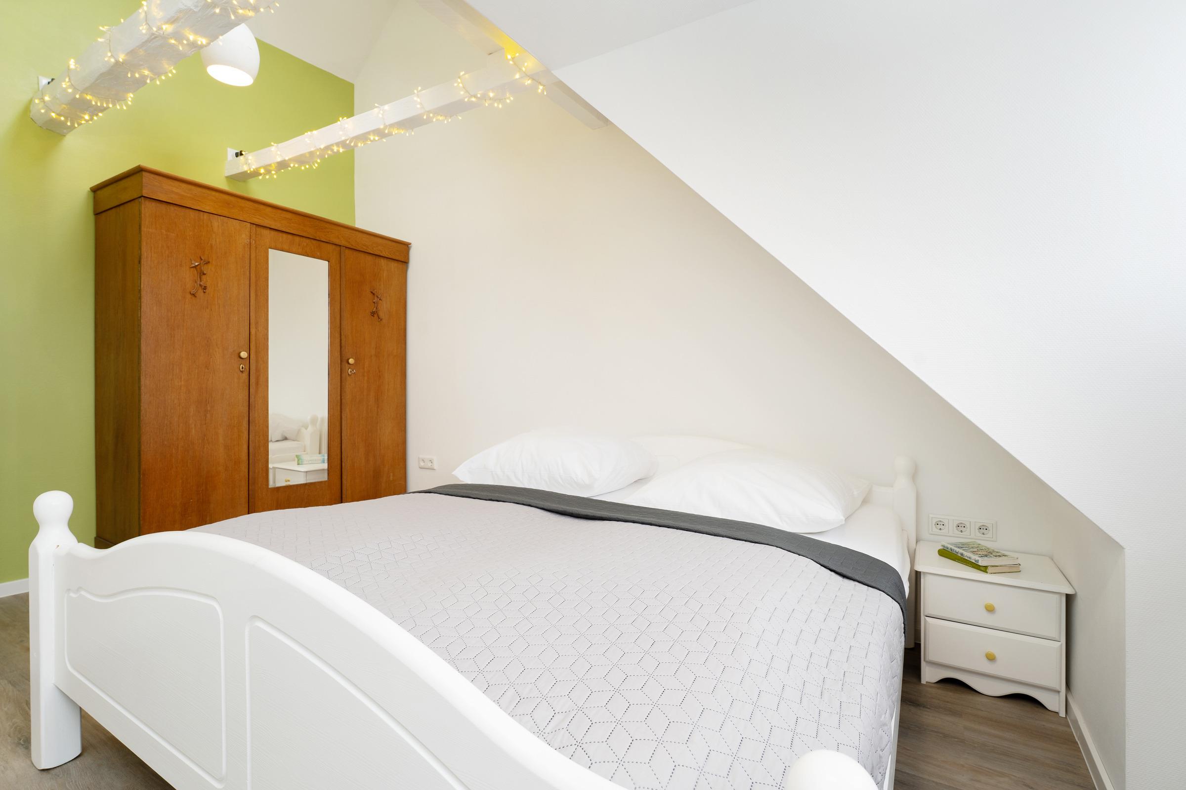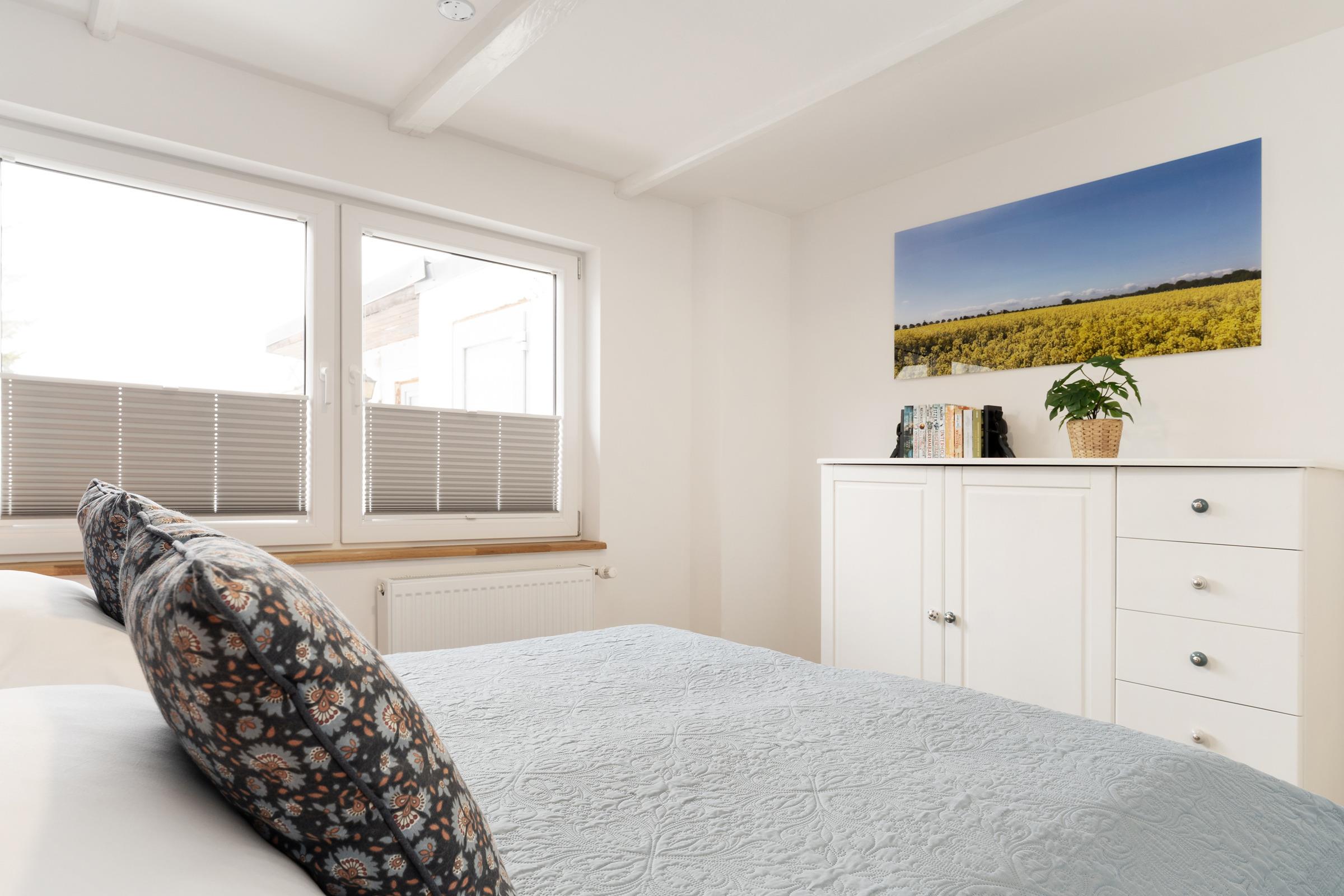 Schlafzimmer 2 (1. OG): 1 Doppelbett (2x 90x200 cm), Kleiderschrank, Verdunkelung: Plissee, Platz für ein Babybett vorhanden