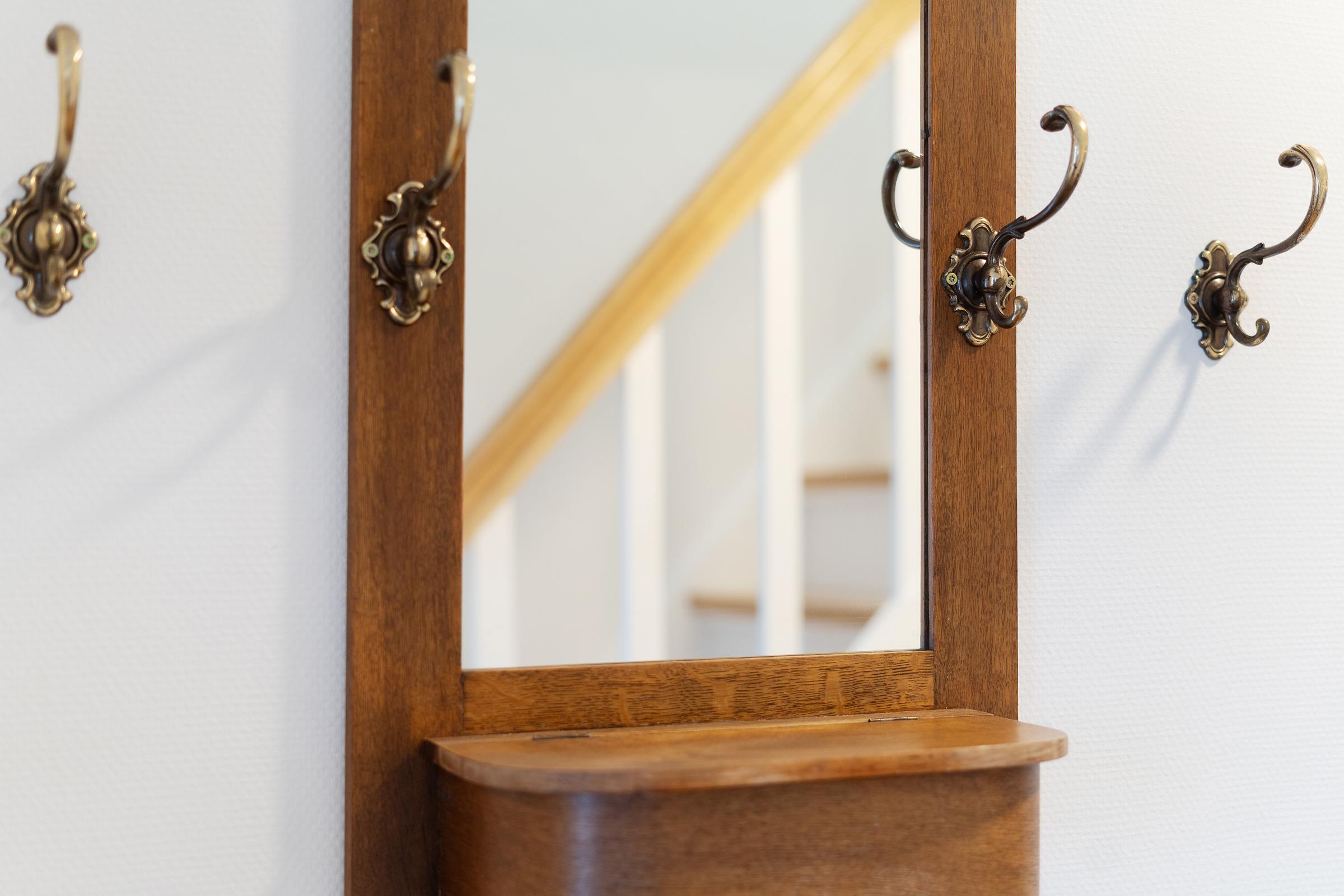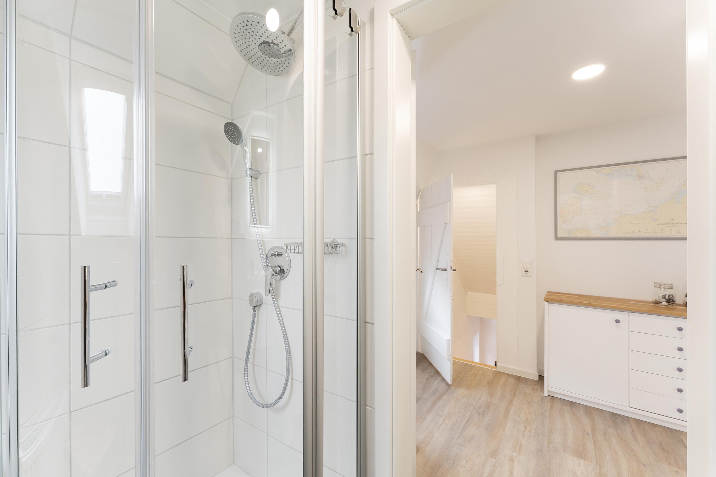 Zwei moderne Bäder runden den Komfort ab. Beide sind mit bodengleichen Duschen und WCs ausgestattet. Im Erdgeschoss sorgt eine Handtuchheizung für angenehme Wärme. Für die kleinen Gäste stehen ein Kinderhochstuhl und ein Kinderreisebett bereit.