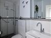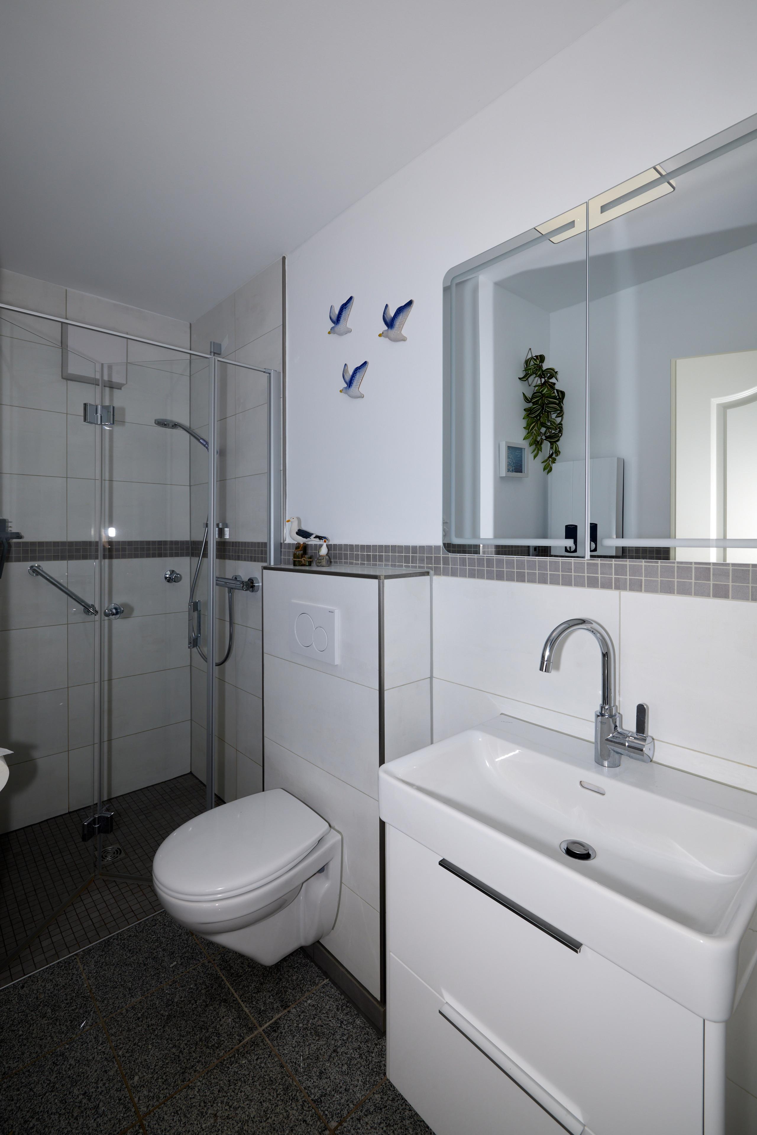 Das Bad ist modern und hat eine ebenerdige Dusche.
