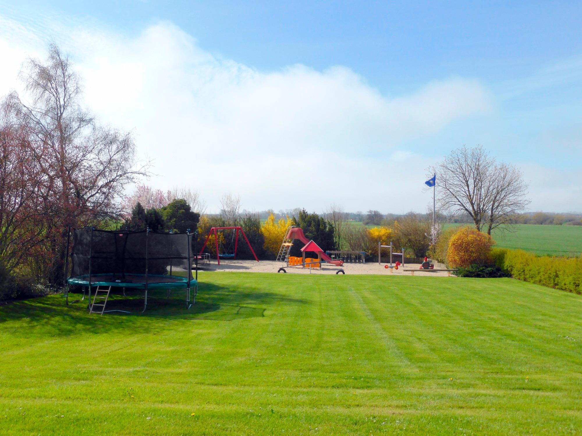 Viel Freiraum zum Spielen ist auf der Wiese am Haus mit dem großzügig angelegten Spielplatz.