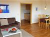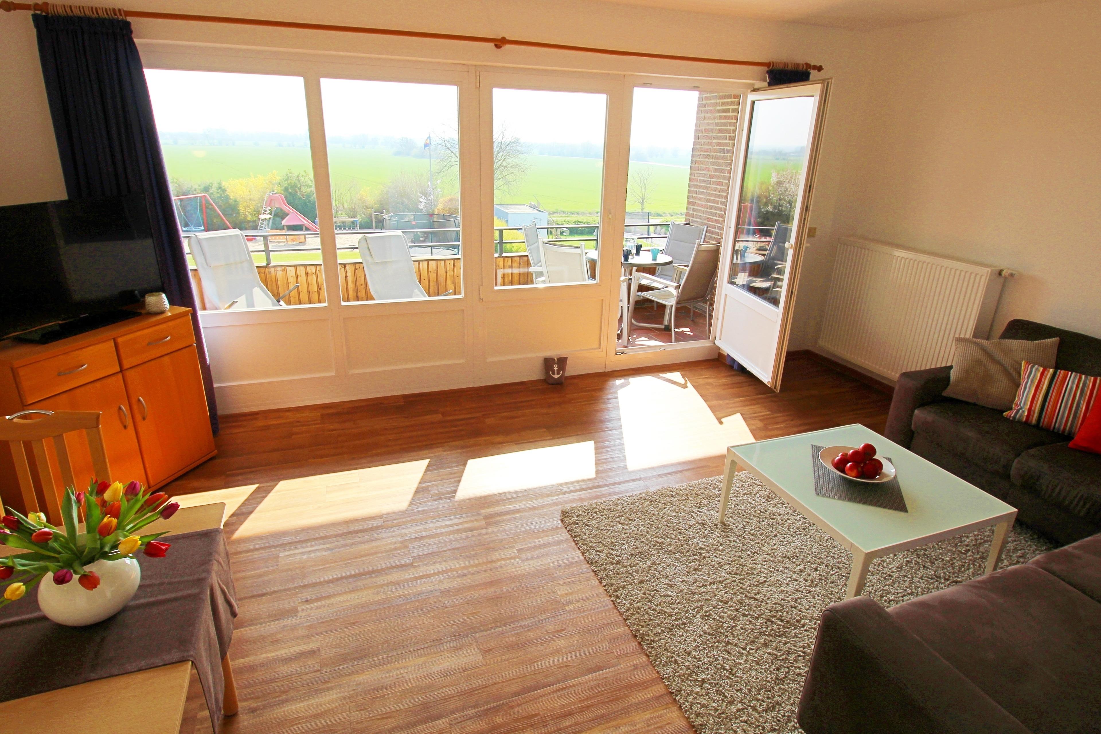 Sie besteht aus einem großen Wohnraum, zwei Schlafzimmern, Küchenzeile, Dusche/WC und ist für bis zu 4 Personen eingerichtet. Der überdachte Balkon erstreckt sich über die gesamte Südfront der Ferienwohnung.