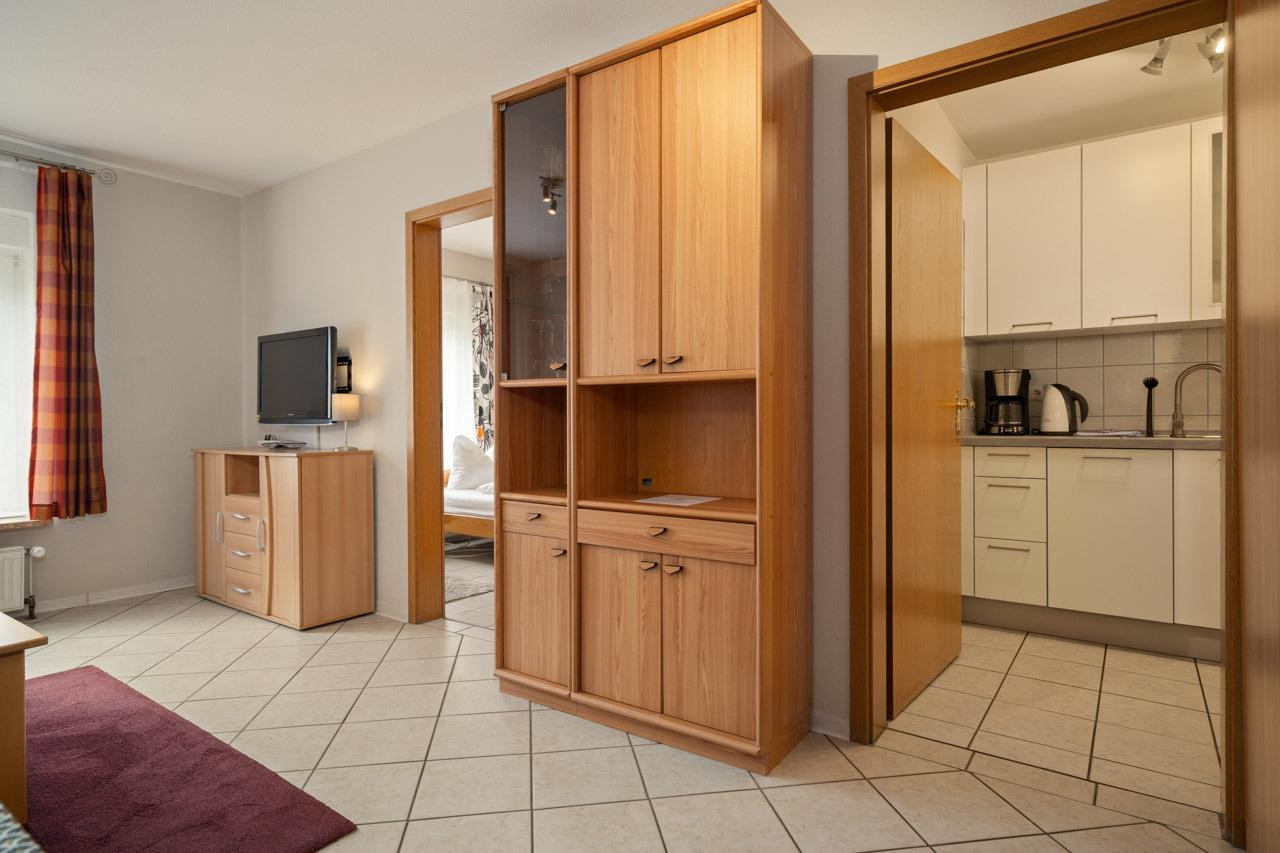 Passend zum Namen Mohnblume wurde die Wohnung mit roten Farbelementen eingerichtet. Das gemütliche Wohnzimmer mit Récamiere-Couch und der Essbereich laden zum Verweilen ein. Die separate Einbauküche mit Cerankochfeld, Backofen, Kühl- und Gefrierkombination sowie Geschirrspüler ermöglicht eine angenehme Selbstverpflegung. Zur Nachtruhe stehen Ihnen zwei Schlafzimmer - eins mit Doppelbett (160x190 cm) und eins mit zwei Einzelbetten (je 90x190 cm) - zur Verfügung. Das hell geflieste Duschbad rundet das Angebot ab.
