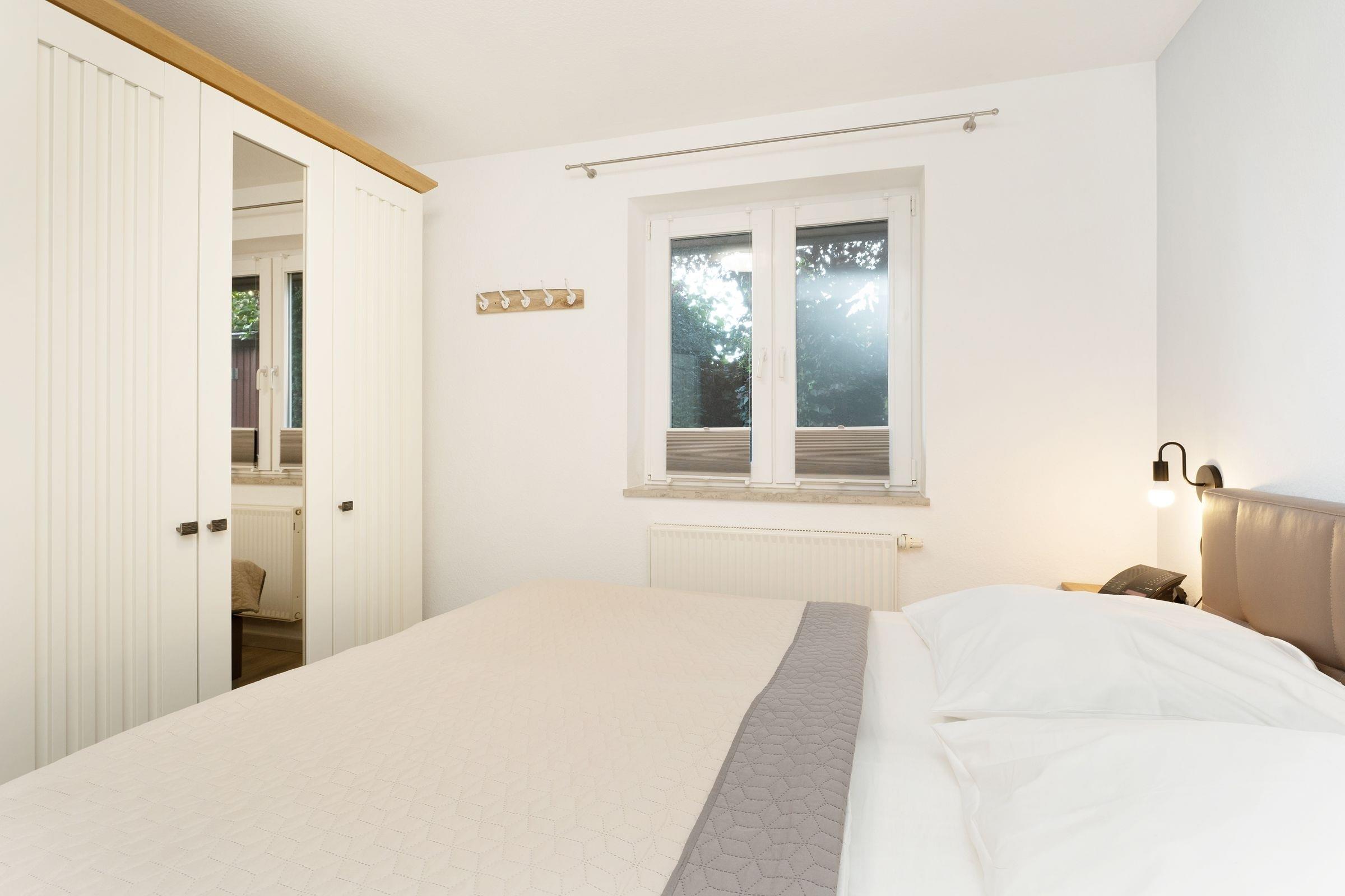 Schlafzimmer: 1 Doppelbett, Verdunkelung: Gardinen, Kleiderschrank, kein Platz für ein Babybett vorhanden