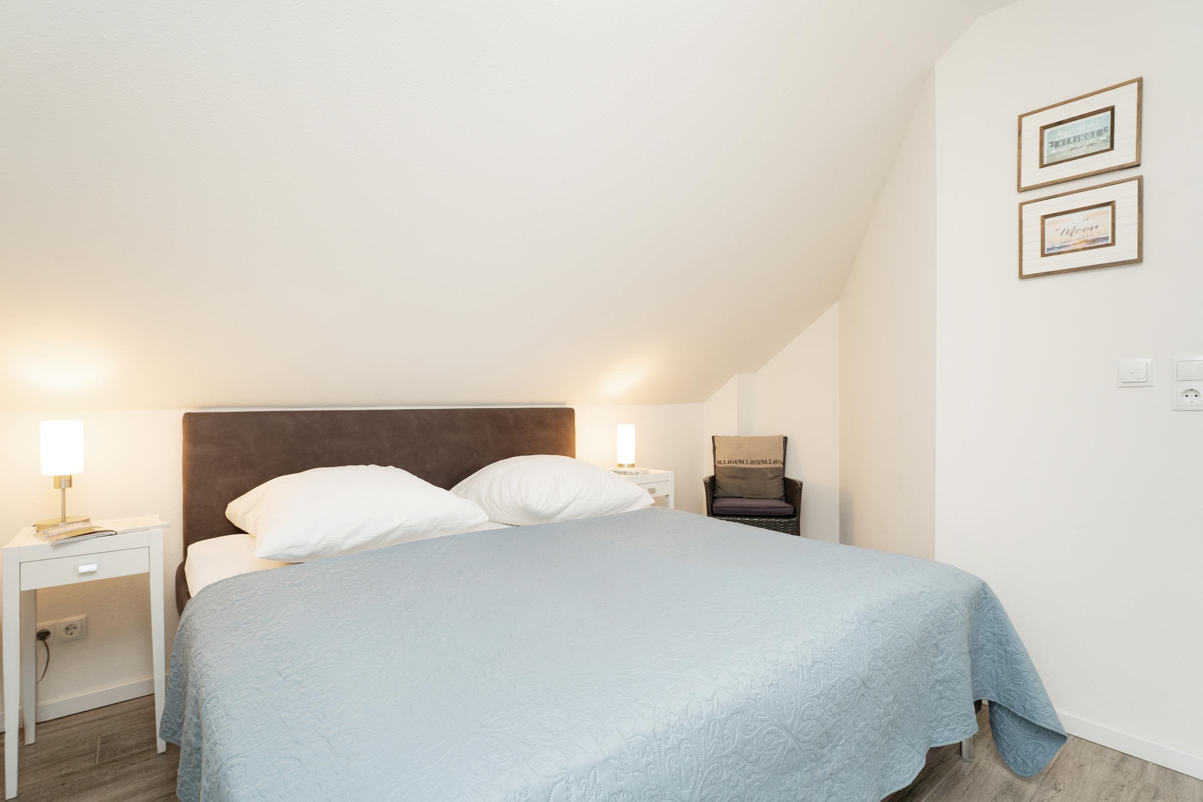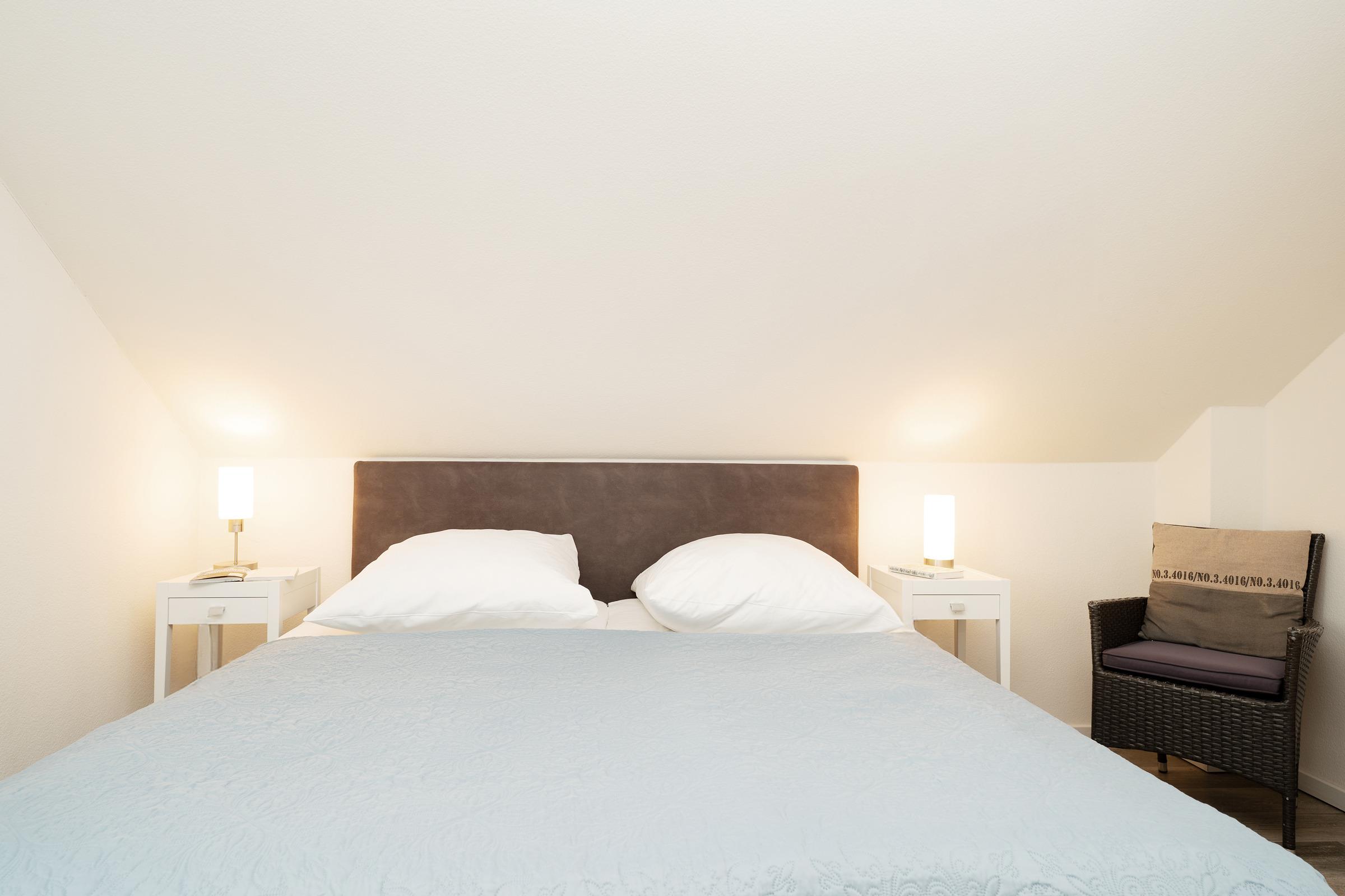 Schlafzimmer: Boxspring-Doppelbett (ca. 180x200cm), Kleiderschrank, Verdunkelung (Außenjalousien), TV, Platz für Kinderreisebett vorhanden