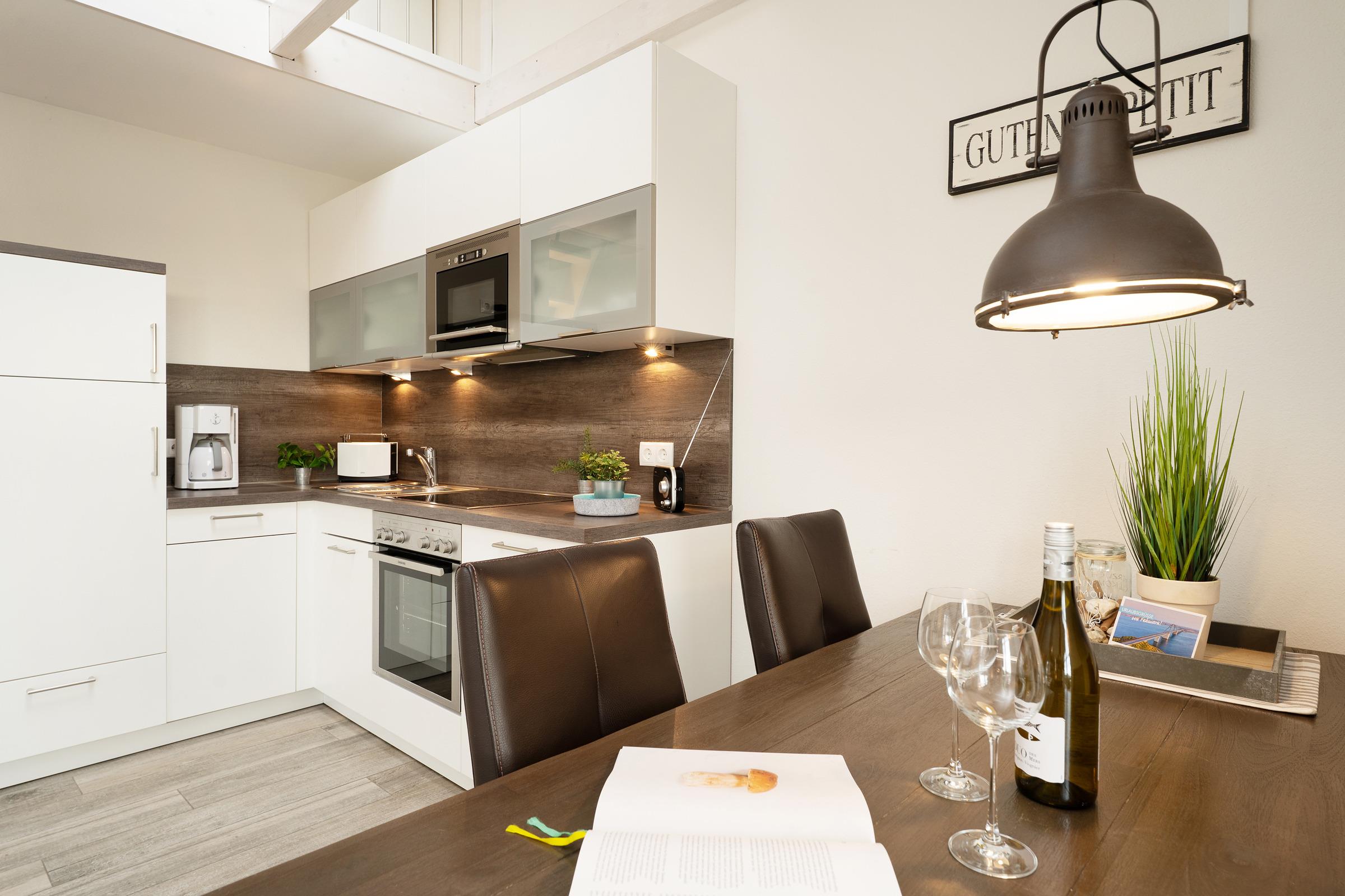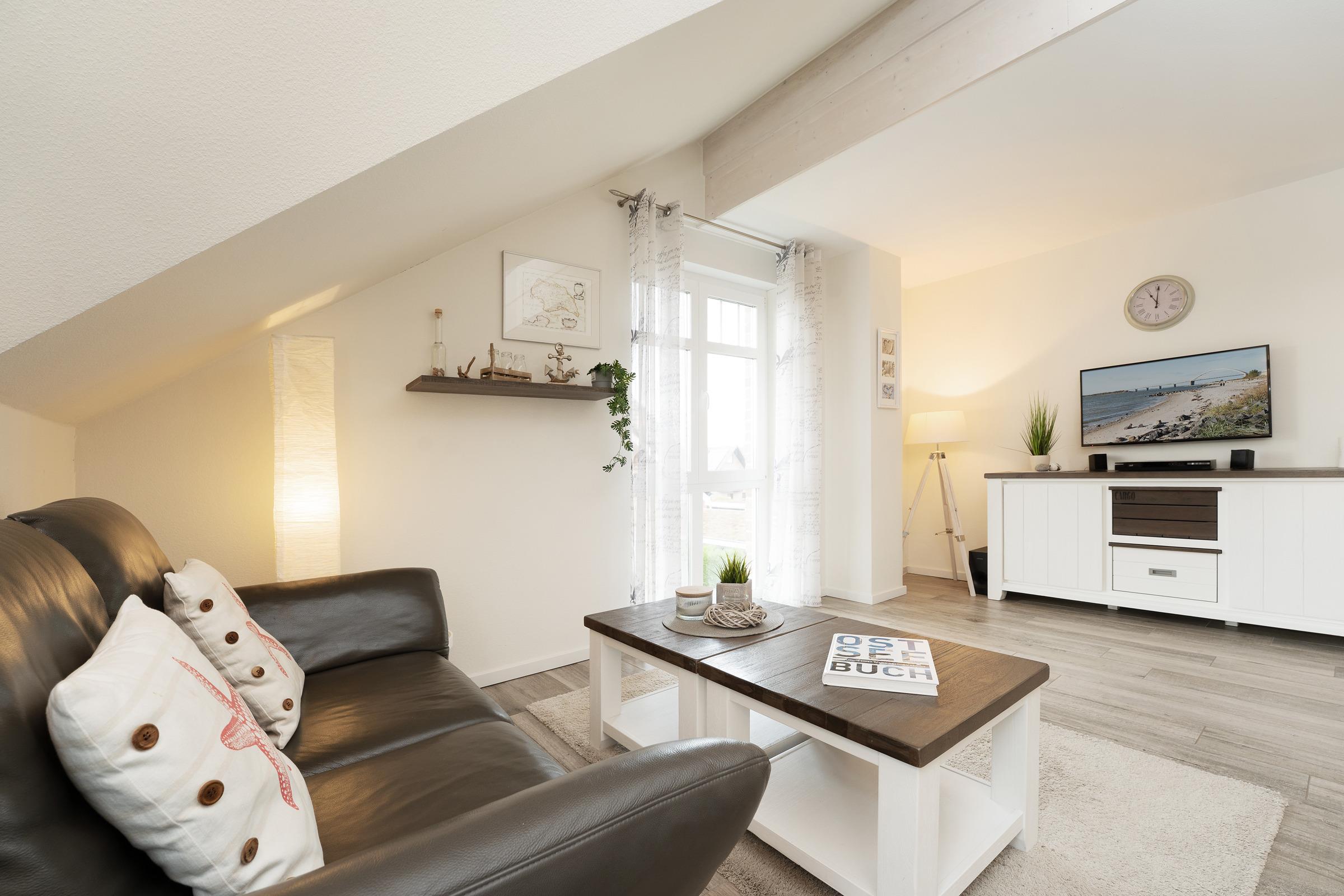Die Wohnung Fehmarn-Brise werden Sie lieben: Sie besticht durch ihre zentrale Lage und die fantastische Aussicht. Genießen Sie im Strandkorb auf dem sonnigen Südbalkon den Blick auf die Ostsee oder lassen Sie sich in den Abendstunden vom Sonnenuntergang verzaubern. Der große Wohn-Essbereich, möbliert im modernen, hellen Landhausstil, ist der Treffpunkt zum Kochen, Klönen, Spielen oder Ausruhen. Auch finden Sie hier den Zugang zum Balkon. Gleichzeitig lädt das gemütliche Ledersofa und der Relax-Sessel zum Fernsehen und Entspannen ein. Die gut ausgestattete Wohnküche hat alles, worauf man auch im Urlaub nicht verzichten möchte: Geschirrspüler, Herd, Backofen, Mikrowelle, Kühlschrank, Kaffeemaschine etc. und wird durch den großen Esstisch komplettiert. Das geräumige Schlafzimmer mit Boxspringbett (180x200 cm), Flachbildfernseher, großen Kleiderschränken und Kommode bietet Platz für ein Baby-Reisebett. Das Bad mit ebenerdiger Dusche rundet diese charmante Wohnung ab. Tipp: In wenigen Fahrrad-Minuten erreichen Sie von hier aus den Südstrand, den Hafen und das Stadtzentrum.