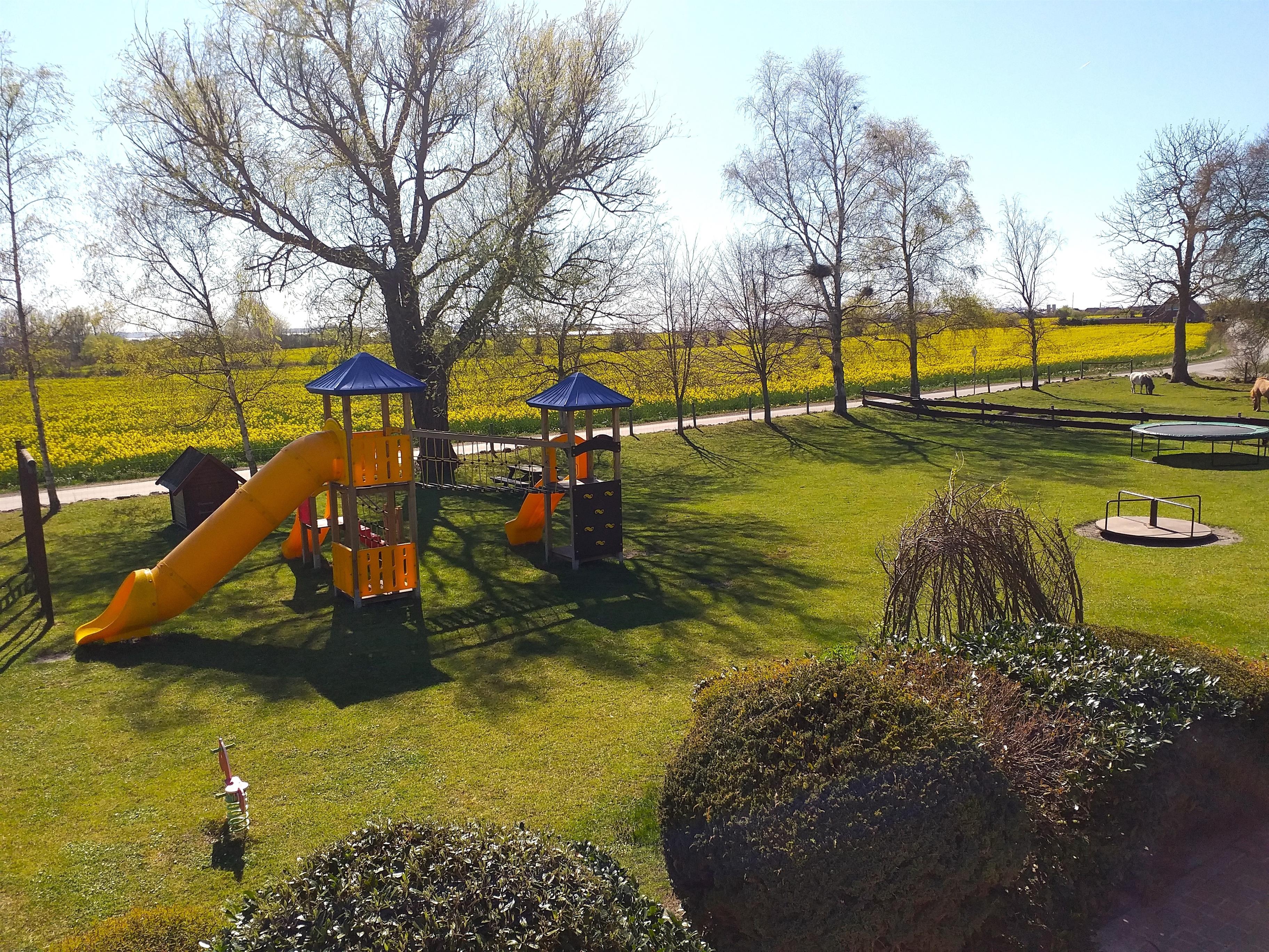 Von Ihrer Terrasse haben Sie einen unverbauten Blick auf den Spielplatz, über die Felder bis zur Ostsee.