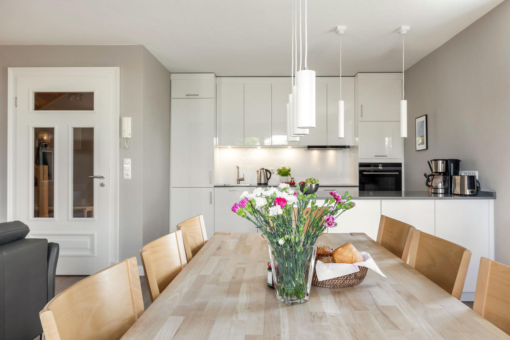 Die offene neue Küche ist in das geräumige Wohnzimmer integriert und wird durch den Essbereich abgerundet.