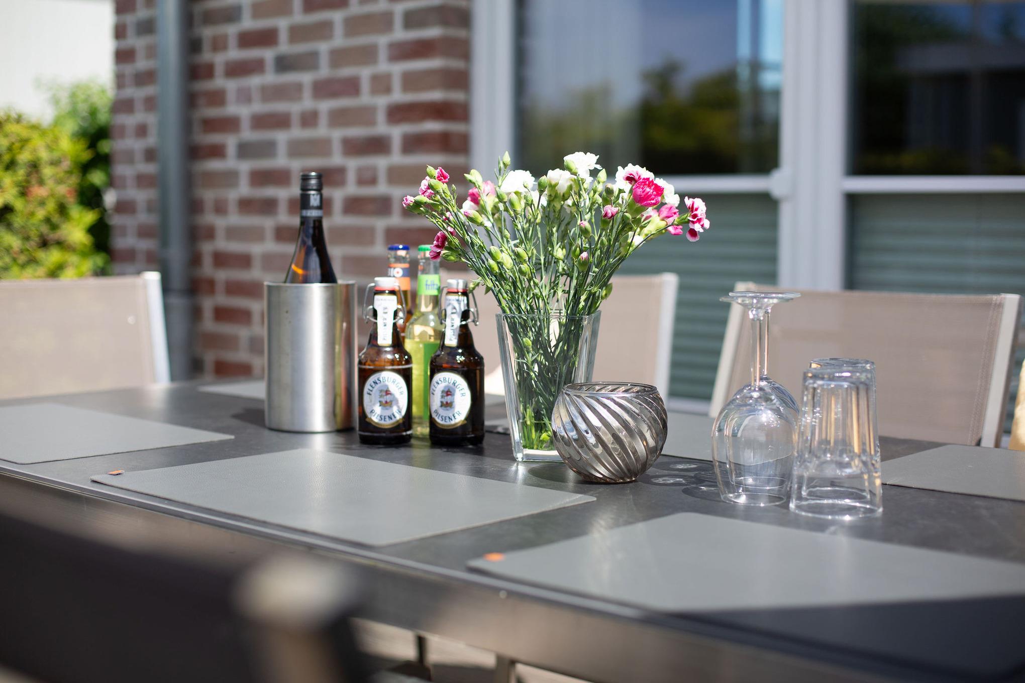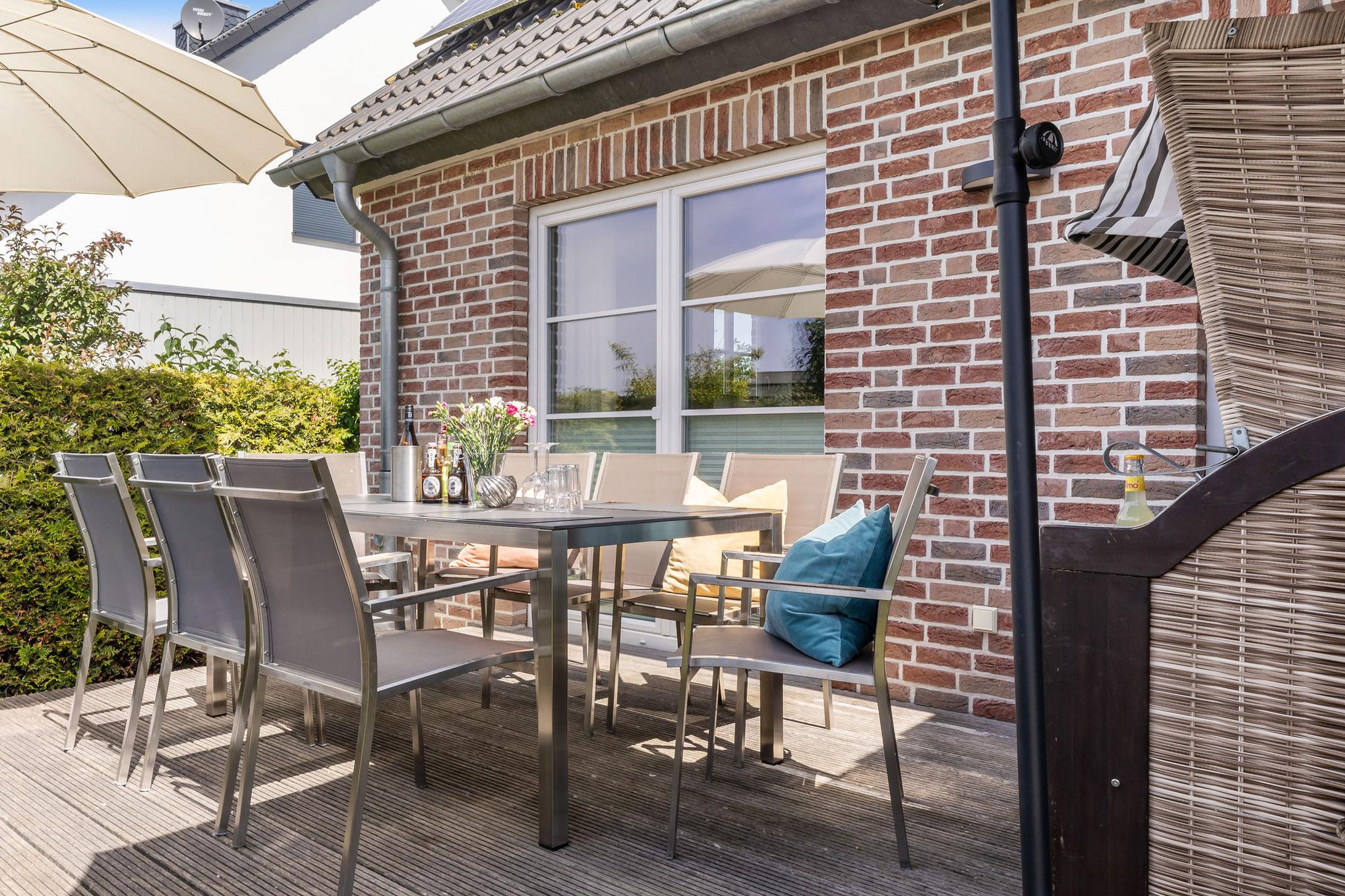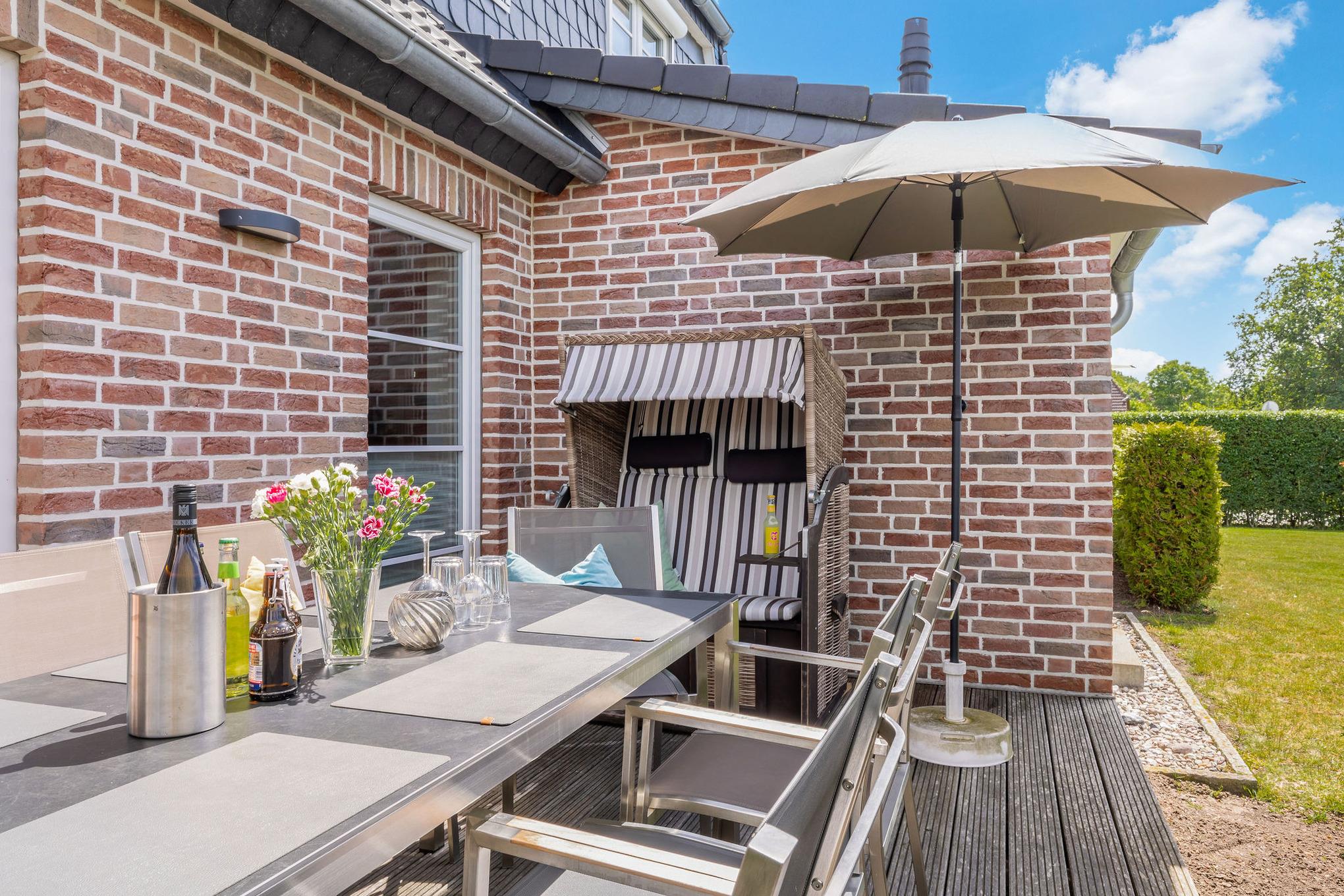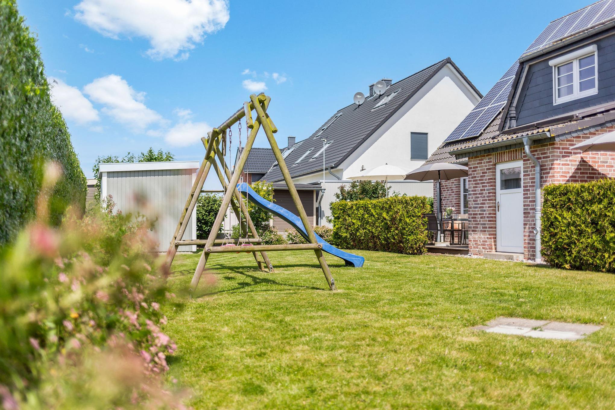 Auf der Terrasse befindet sich ein Strandkorb, im Garten eine Rutsche und Schaukel für die Kinder zur gemeinsamen Nutzung des kompletten Hauses.