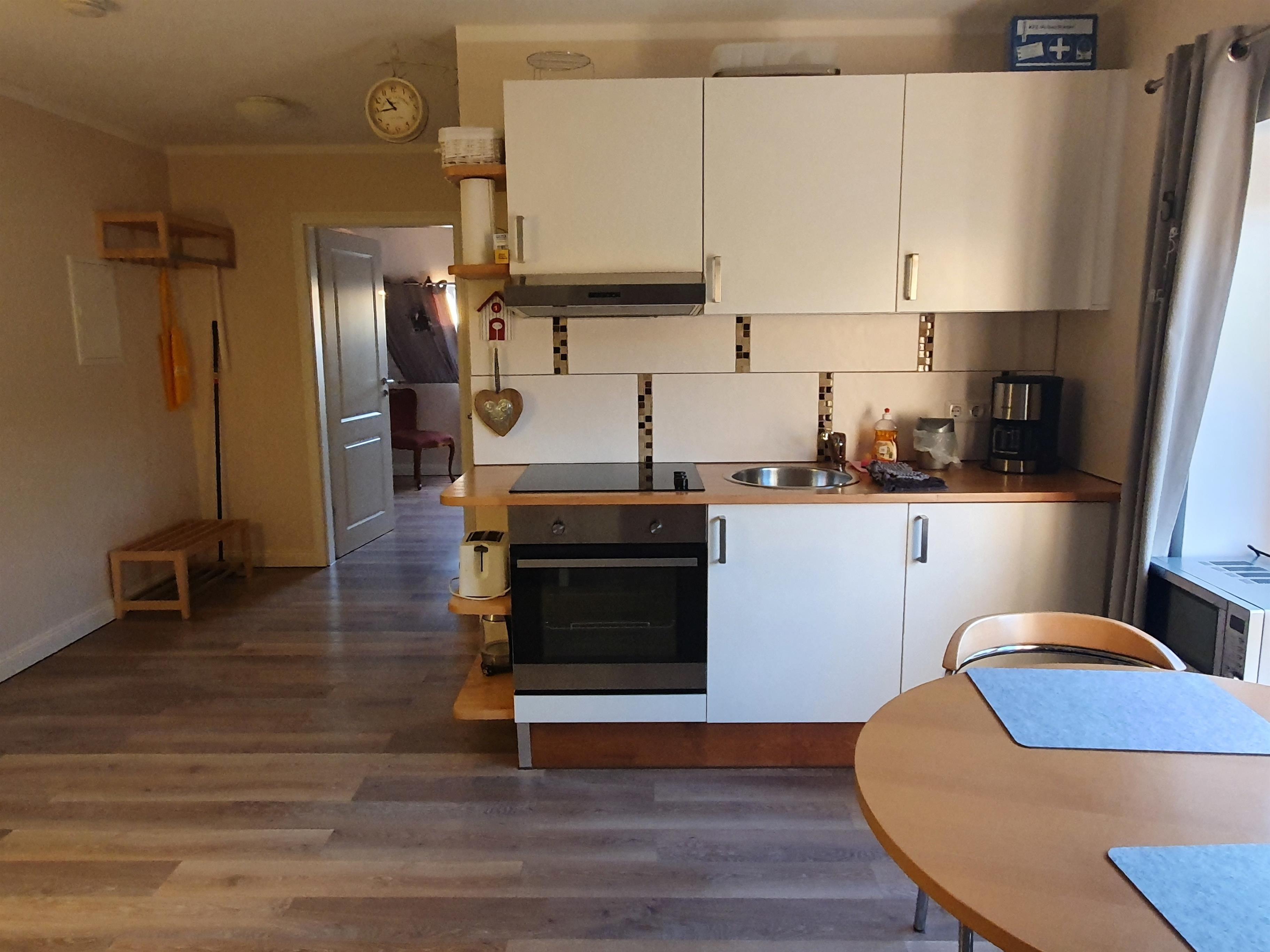 Die hell und modern eingerichtete Ferienwohnung wurde 2013 komplett und aufwändig grundsaniert und bietet Platz für 2 Personen. Die großzügig gestaltete Wohnküche ist ausgerüstet mit Ceran-Kochfeld, Mikrowelle sowie einem gemütlichen Sitzplatz mit Blick ins Grüne.