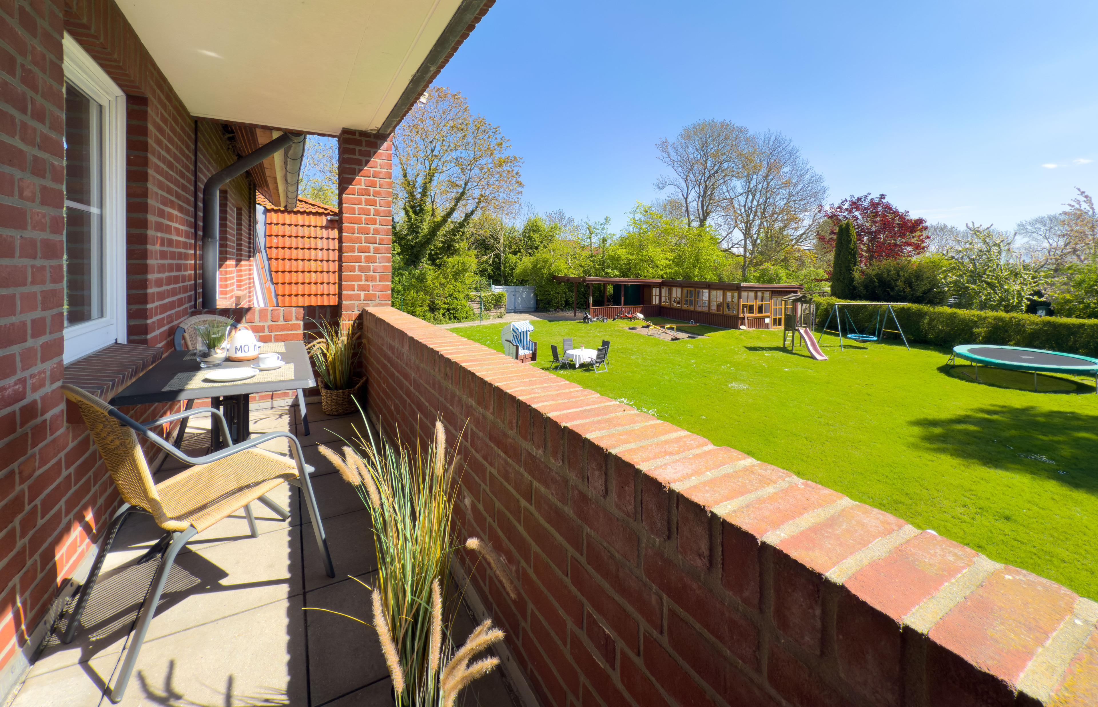 Genießen Sie die Ostseebriese auf Ihrer Terrasse oder dem Balkon. Der große Garten lädt zum träumen ein. Unsere kleinen Gäste nutzen den Spielplatz oder das Gartenhaus während die Eltern im Strandkorb verweilen.