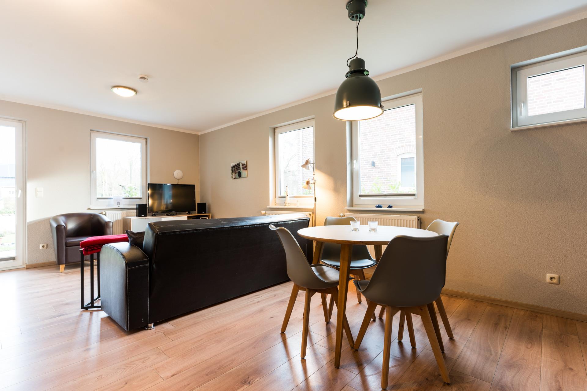 Im großzügigen Wohn-Ess-Zimmer erwarten Sie ein Flachbild-TV mit DVD-Player, ein Radio und ein CD-Player.