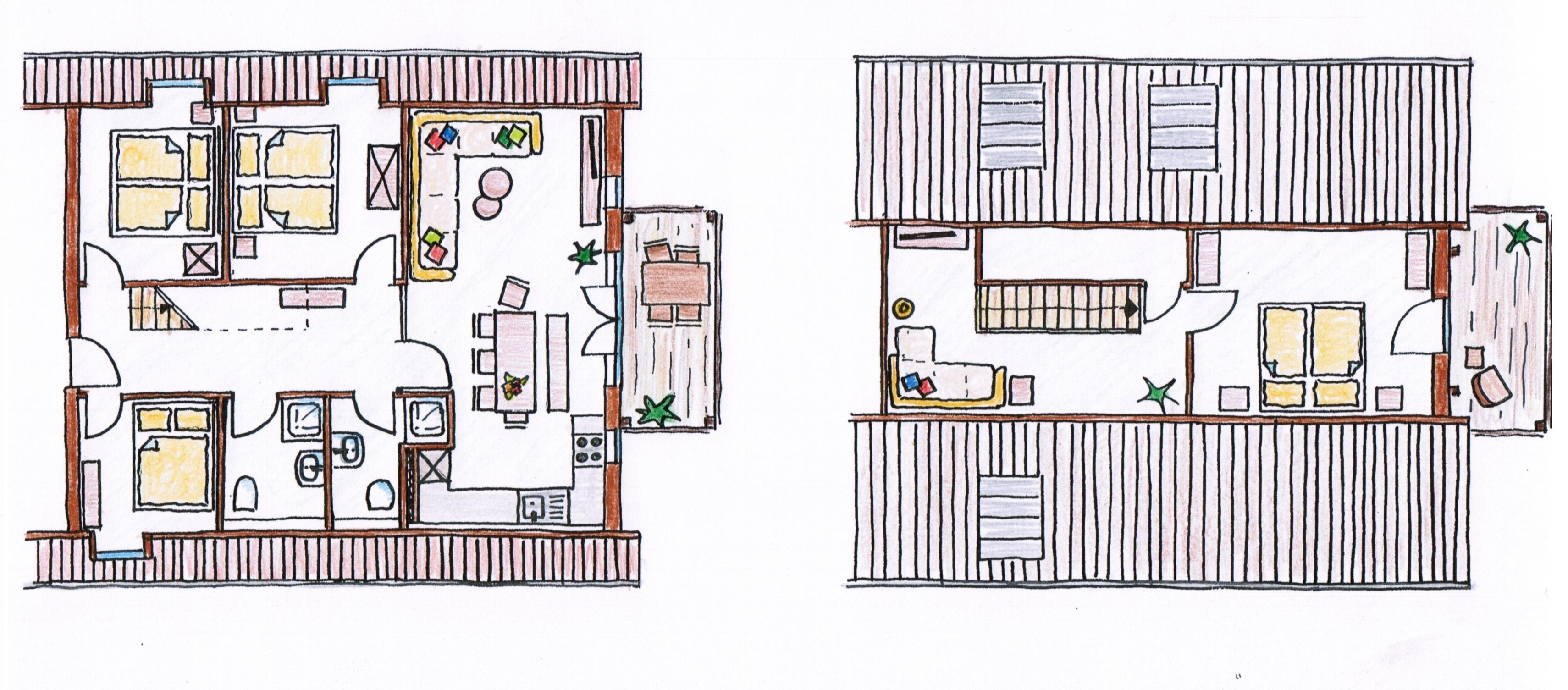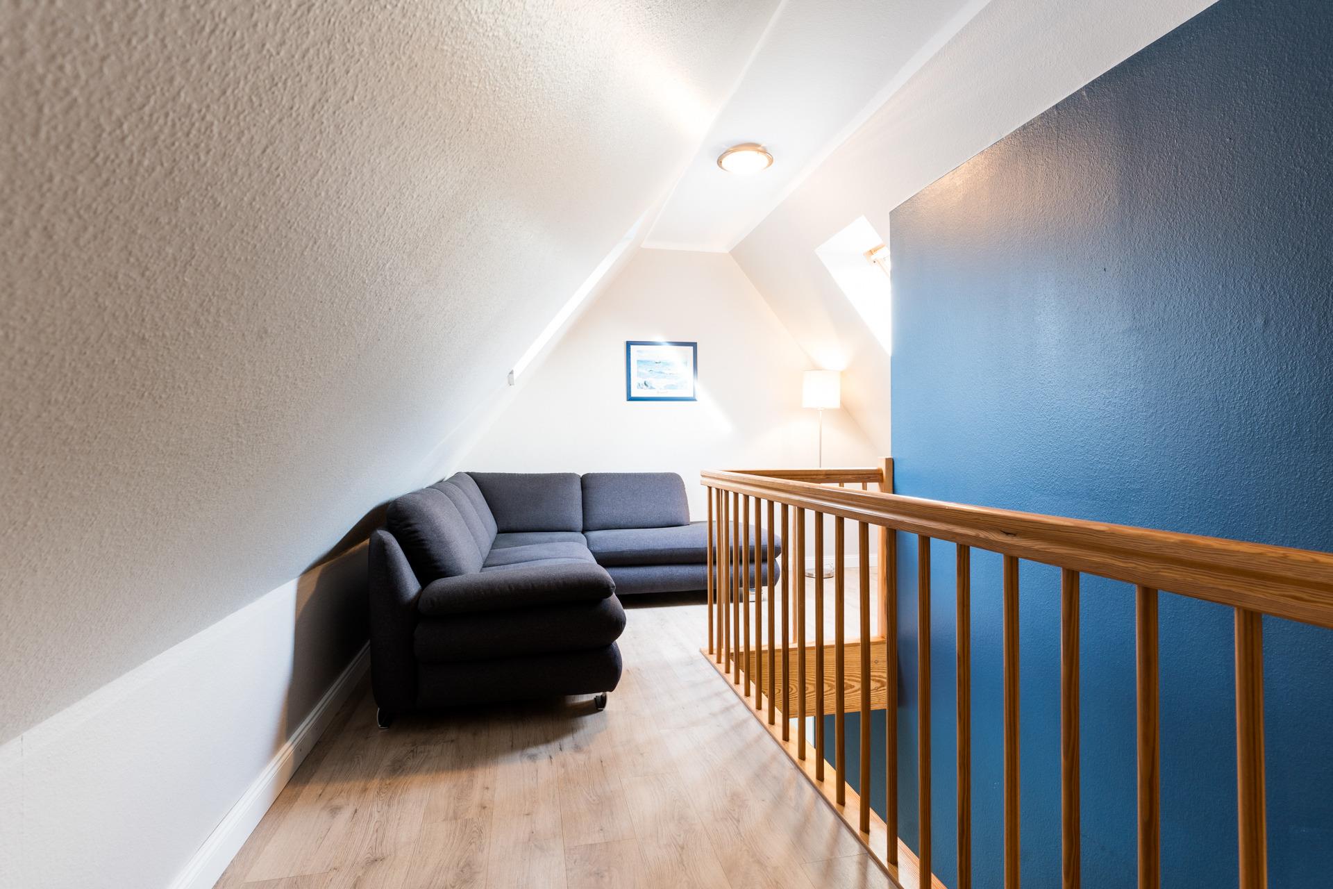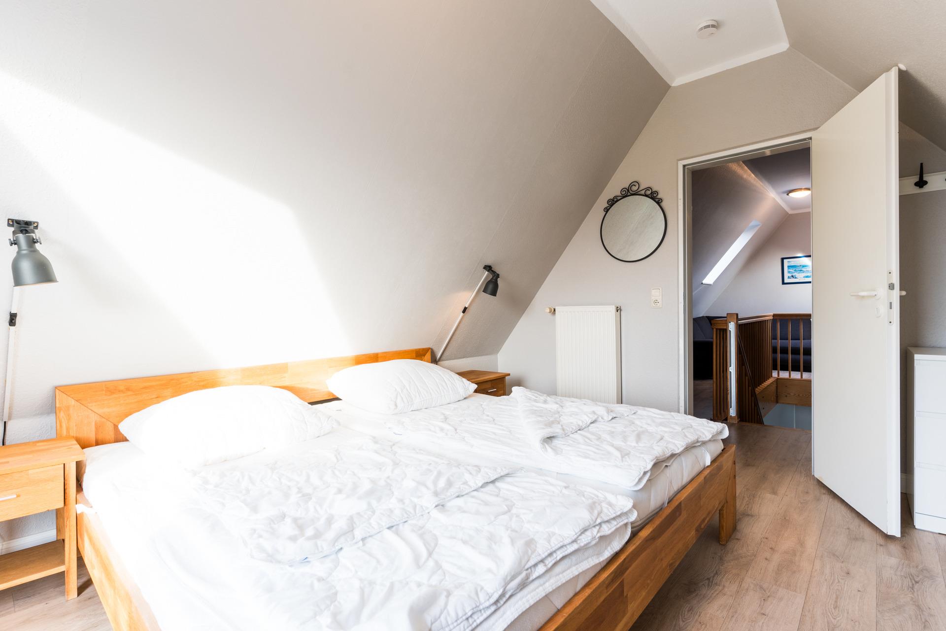 Drei Schlafzimmer mit Doppelbetten ausgestattet befinden sich auf der unteren Ebene, das vierte Schlafzimmer befindet sich im Spitzboden und ist mit einem Doppelbett ausgestattet.