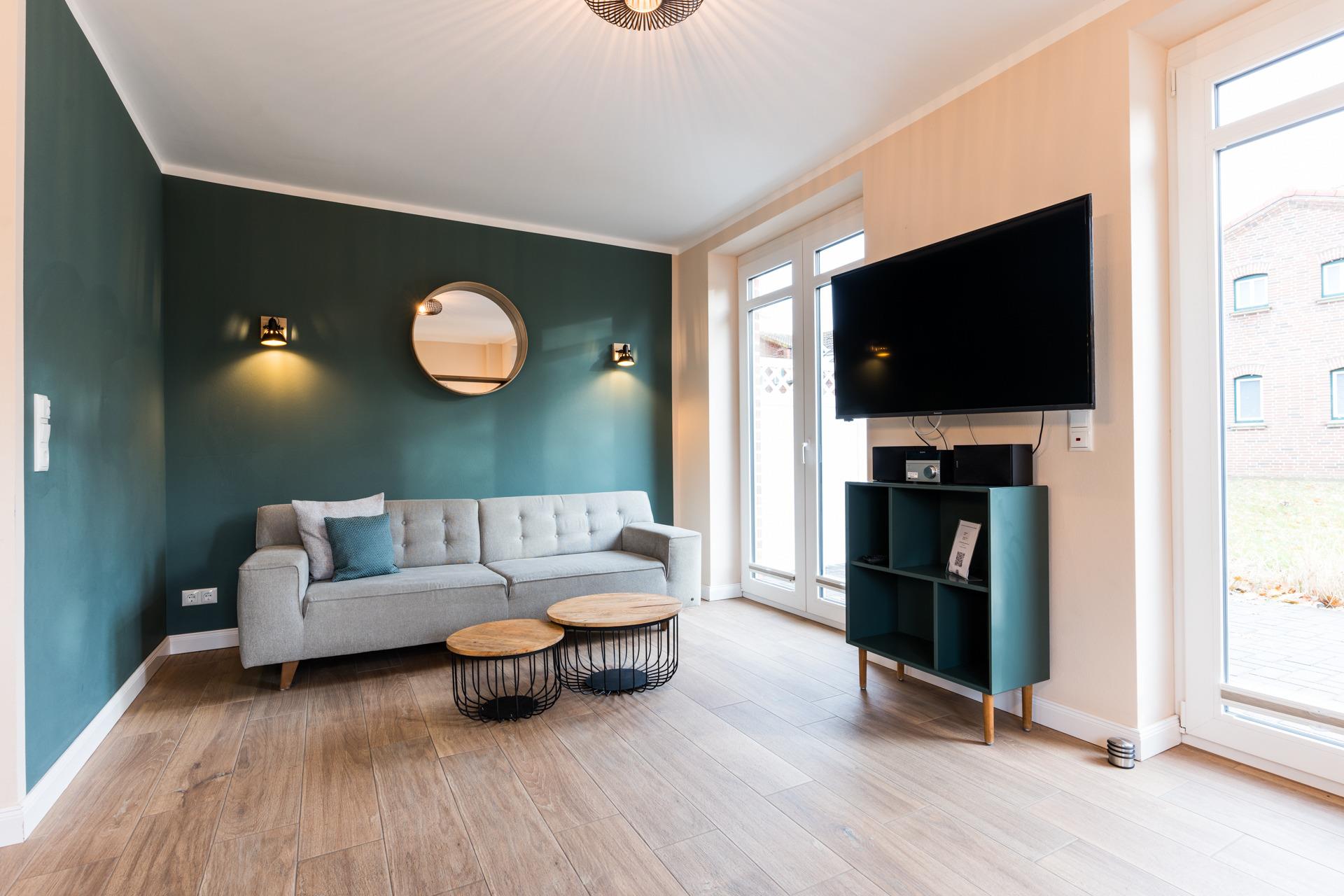 Im gemütlichen Wohn-Ess-Zimmer mit Blick auf den Garten erwarten Sie ein Flachbild-TV, ein Radio und ein CD-Player.