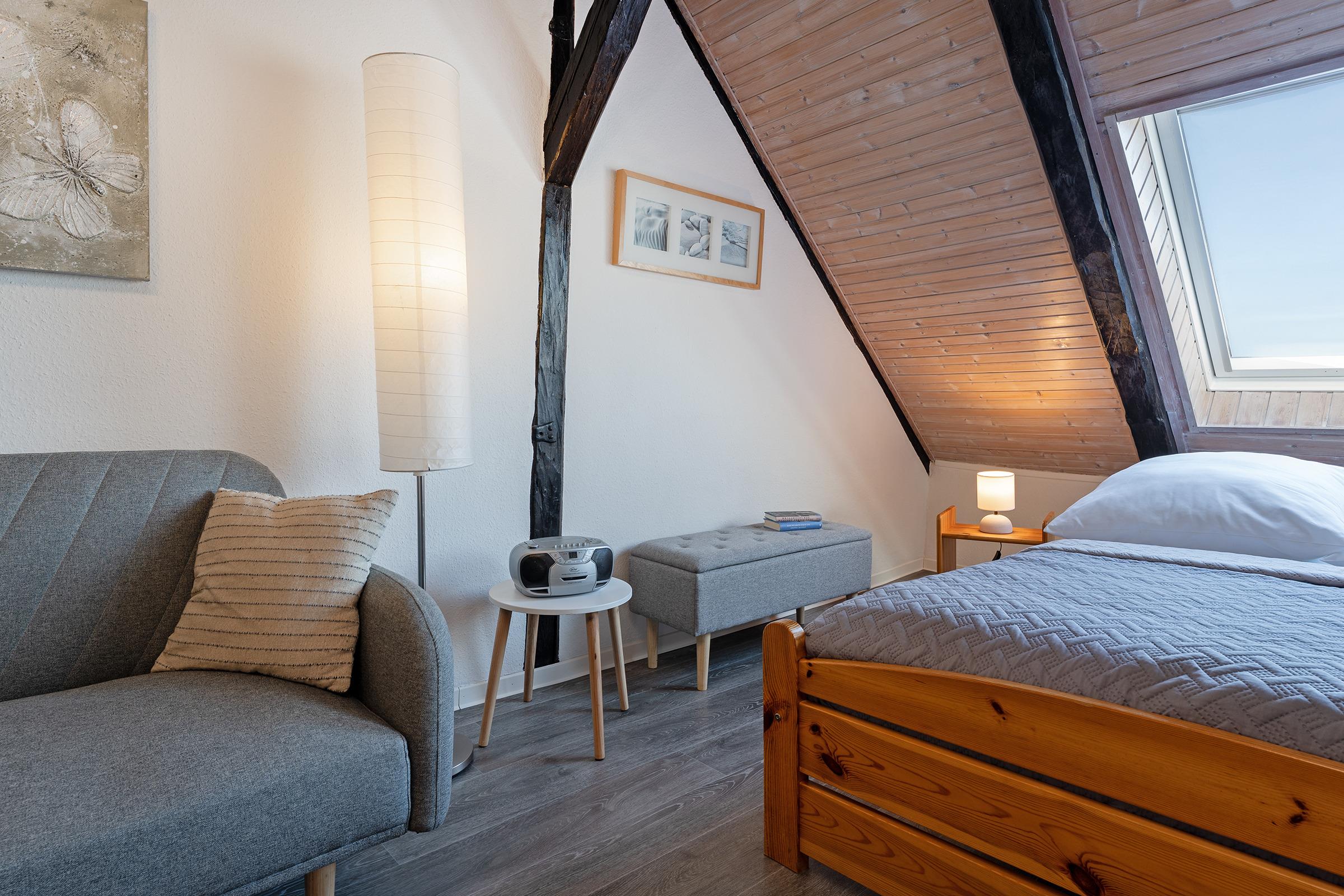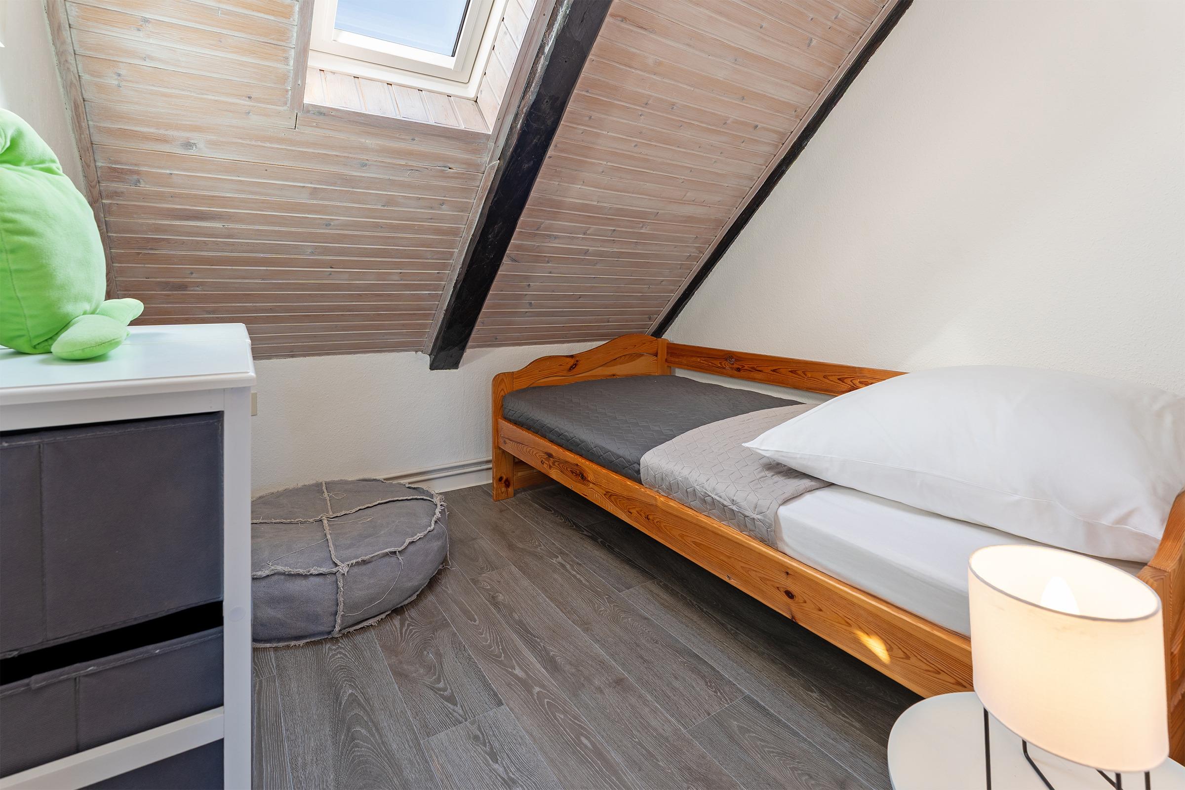 Schlafzimmer: Einzelbett, Verdunkelung: Rollos