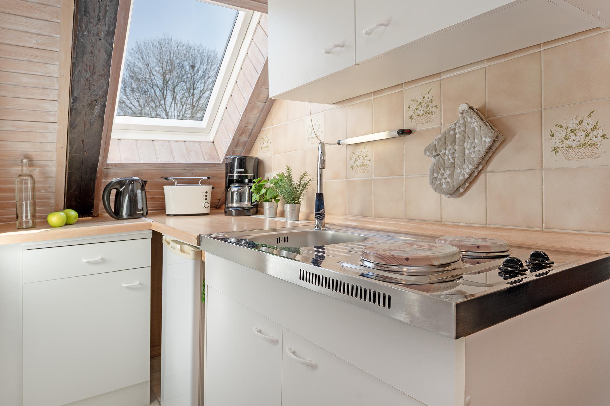 Das charmante Gebäude wurde im Fachwerkstil erbaut und liegt idyllisch am Dorfteich. Die Ferienwohnung besticht durch eine liebevoll ausgesuchte Einrichtung. Im geräumigen, kombinierten Wohn-/Schlafraum befindet sich neben einer kuscheligen Sitzecke mit TV ein Doppelbett unter gemütlichen Dachschrägen. Im separaten Schlafraum steht ein Kojenbett. Die Kochnische eignet sich gut, um sich auch im Urlaub seine Lieblingsspeisen zu kochen. Das Badezimmer erwartet Sie mit Dusche, WC und Fenster. Freuen Sie sich bei gutem Wetter auf einen ruhigen Terrassenplatz im Garten.