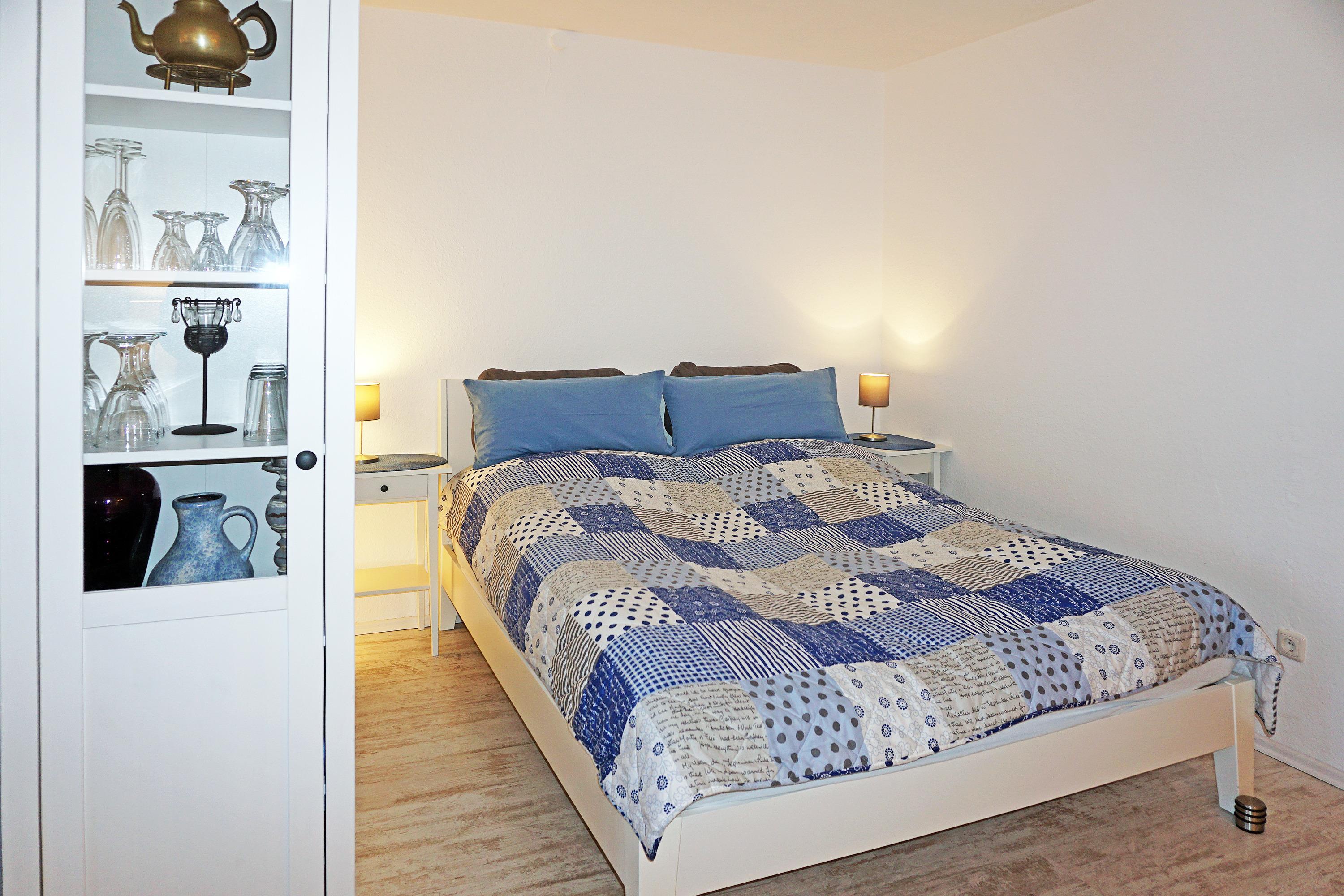 Der Schlafbereich verfügt über ein Doppelbett mit zwei Nachtschränken sowie einem Kleiderschrank, welche das schöne Ambiente abrunden.