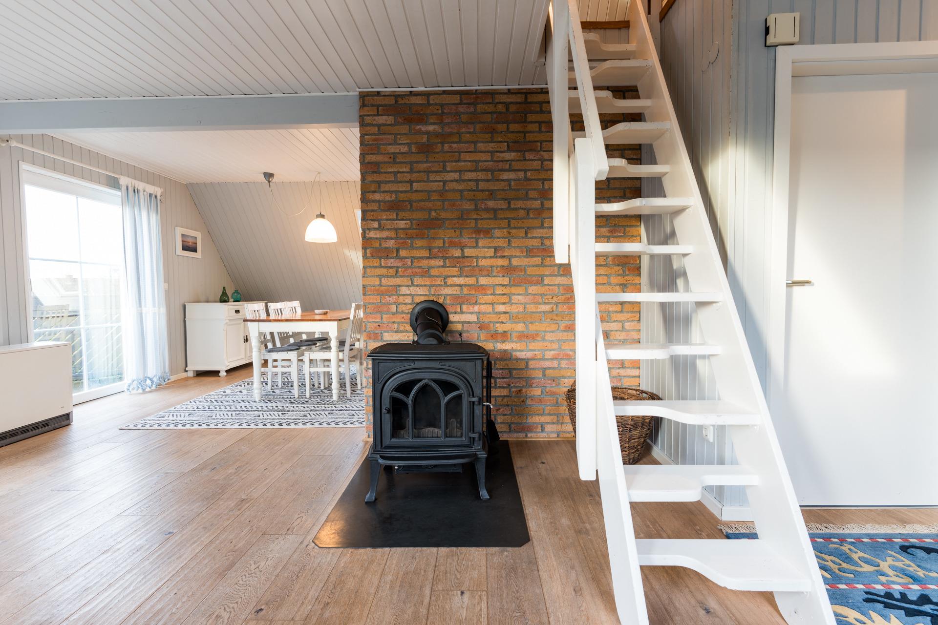 Im lichtdurchfluteten Wohn-Esszimmer erwarten Sie ein Flachbild-TV mit DVD-Player, ein Radio und ein CD-Player. Ein Kaminofen rundet das behagliche Ambiente ab.