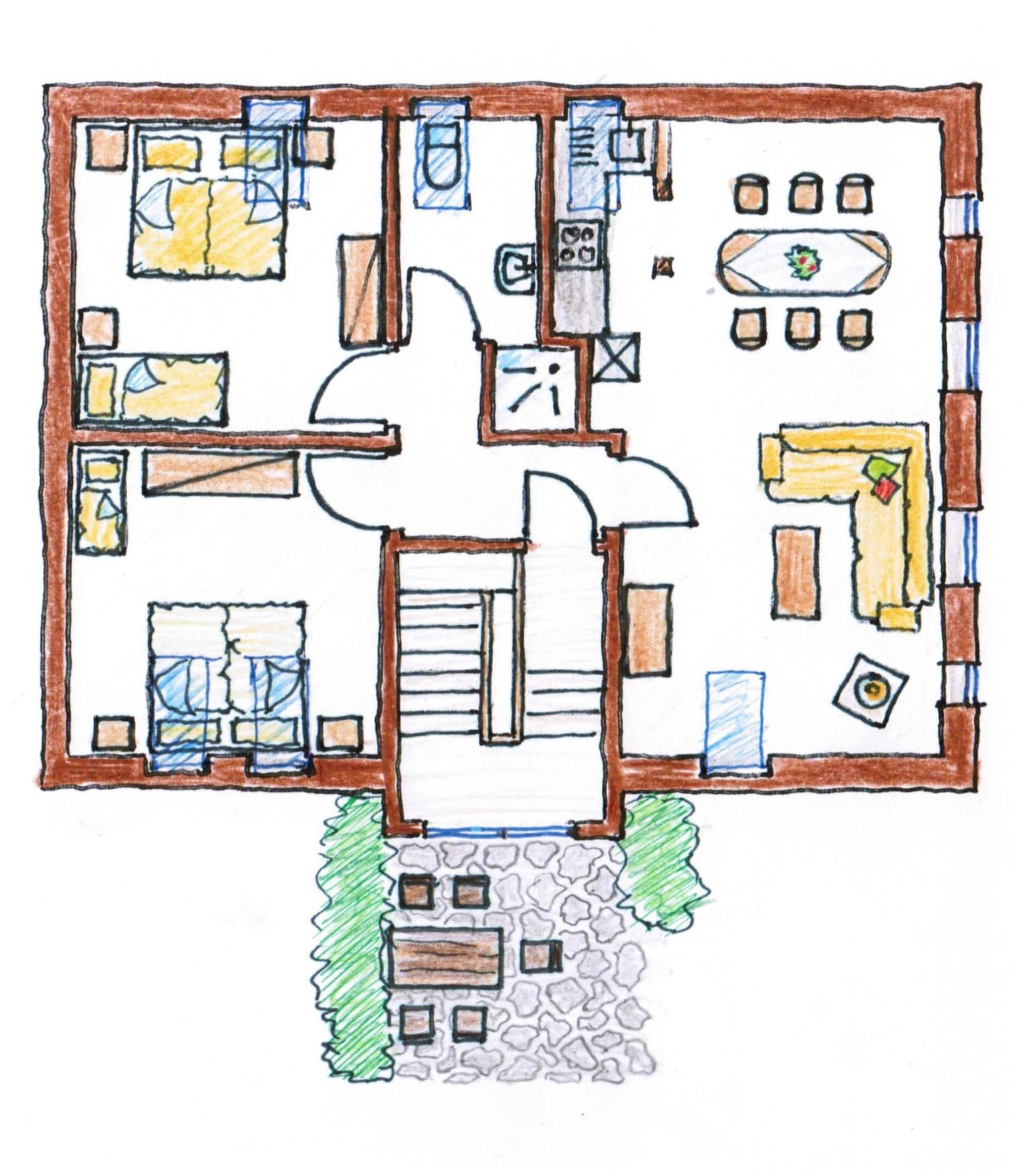 Zur Wohnung gehört ein abgeschlossenes Treppenhaus - früher der Eingang zum alten Schulhaus - und eine möblierte Südterrasse. Von hier aus gelangen Sie in den großen Garten, wo die Kinder Trampolin springen und Fußball spielen können.