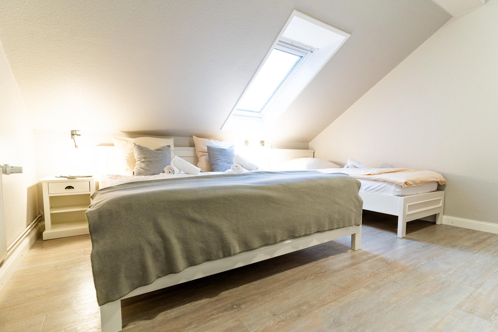 Ein Schlafzimmer mit 1 Doppelbett und 1 Kindergitterbett, ein weiteres Schlafzimmer mit 1 Doppelbett und 1 Einzelbett.