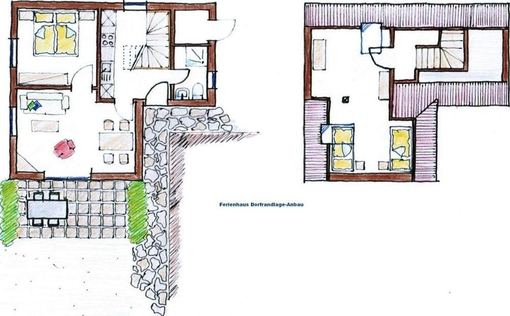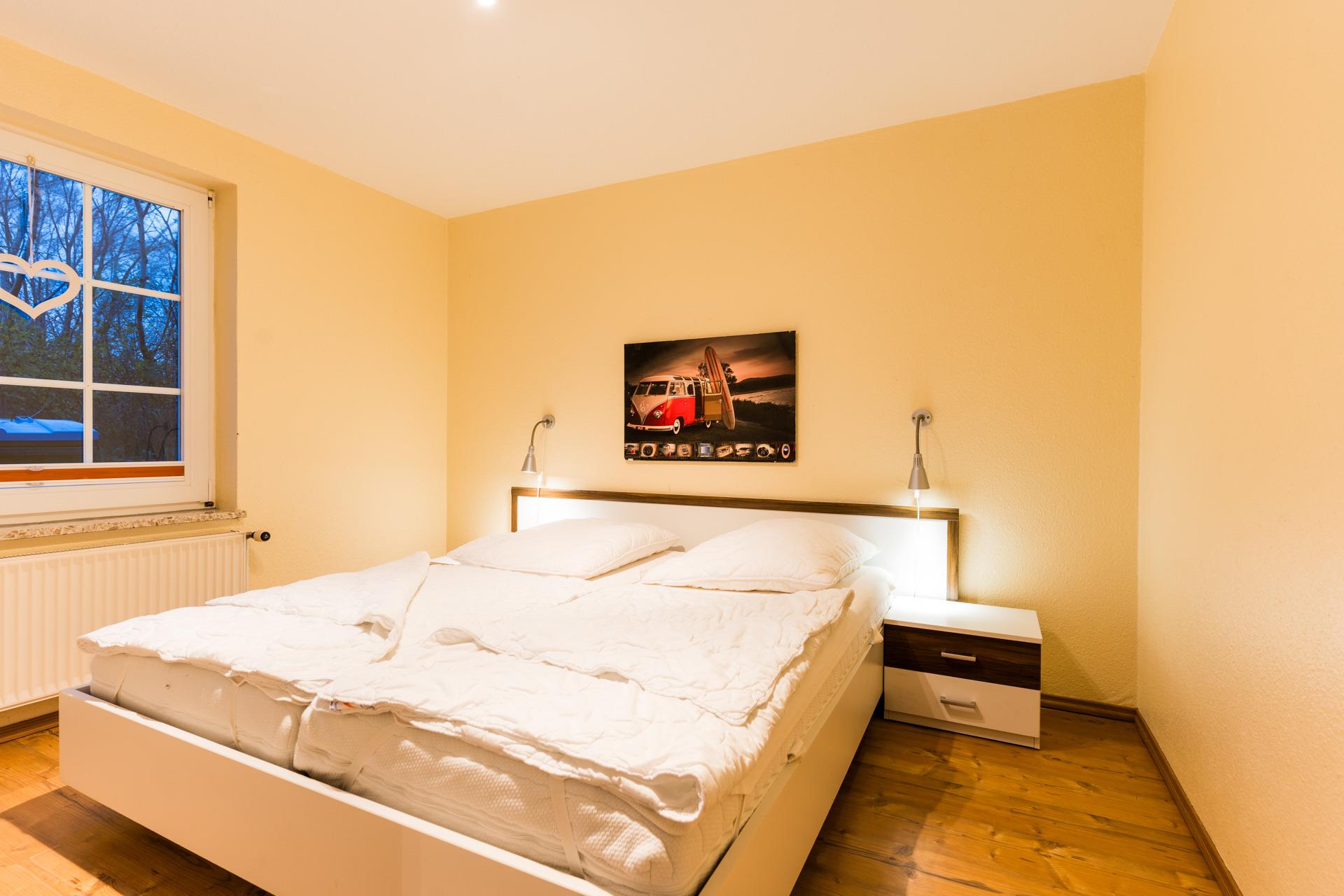 Das Elternschlafzimmer mit 1 Doppelbett befindet sich im Erdgeschoss, ein Schlafzimmer mit 2 Einzelbetten liegt im gemütlichen Spitzboden.
