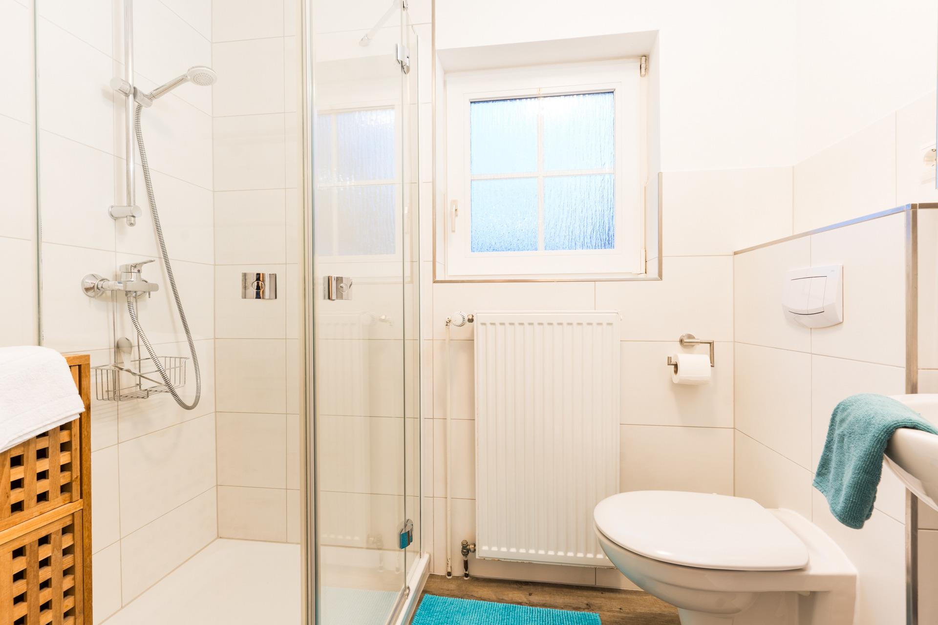 Es gibt außerdem ein Duschbad mit WC .