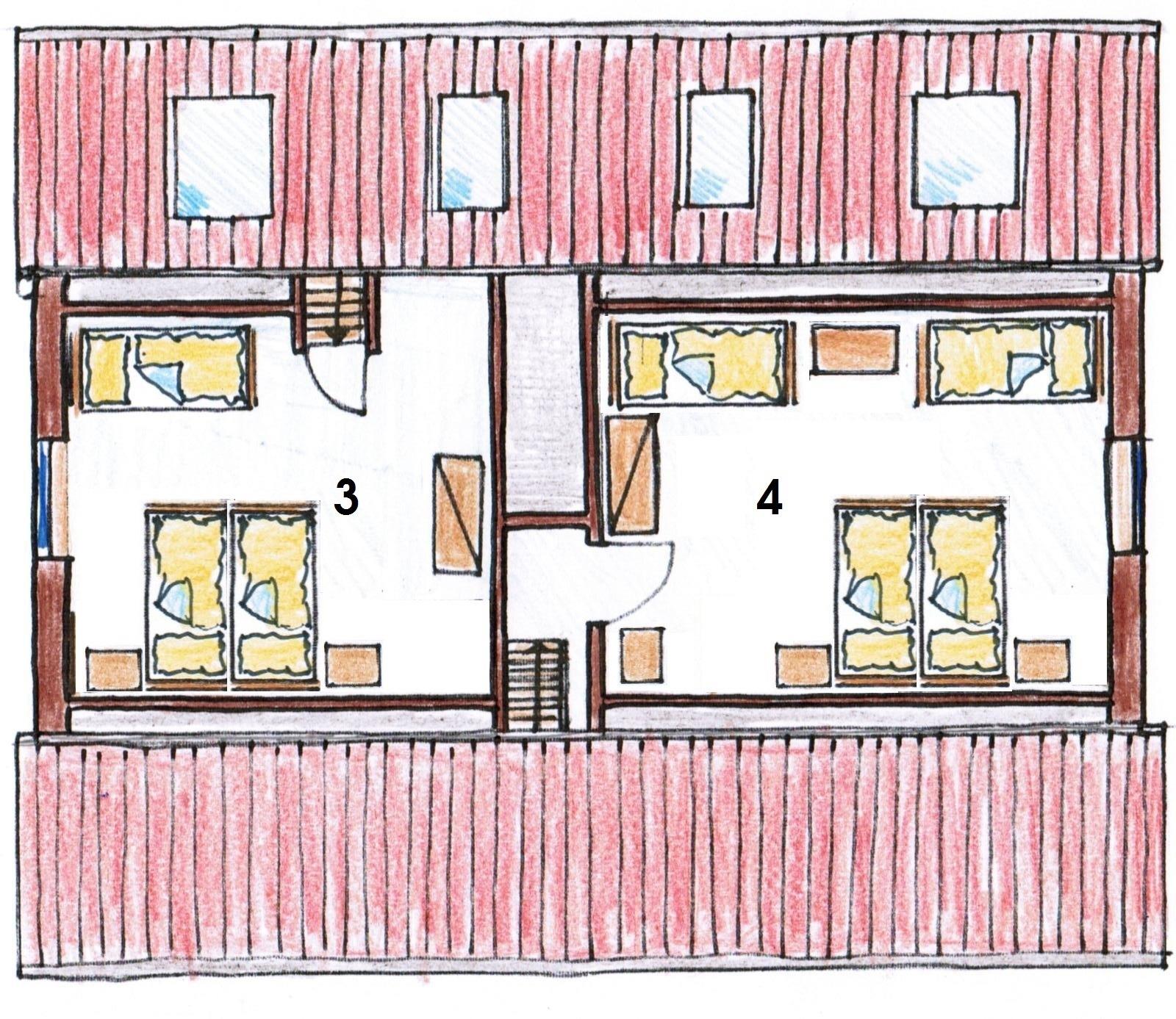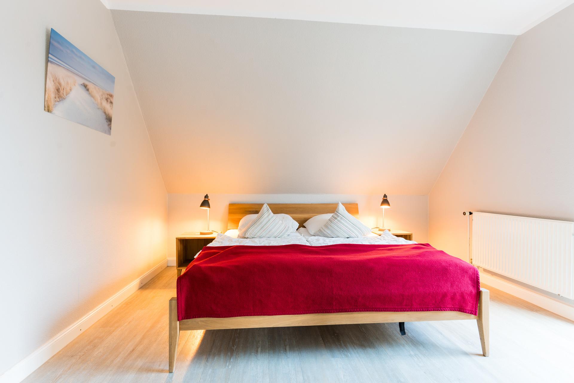 Ein Schlafzimmer ist mit 1 Doppelbett ausgestattet, das Schlafzimmer im Dachgeschoss mit 1 Doppelbett und 1 Einzelbett. Die Treppe zum Dachgeschoss ist relativ steil, daher empfehlen wir, für kleine Kinder das untere Schlafzimmer zu nutzen.