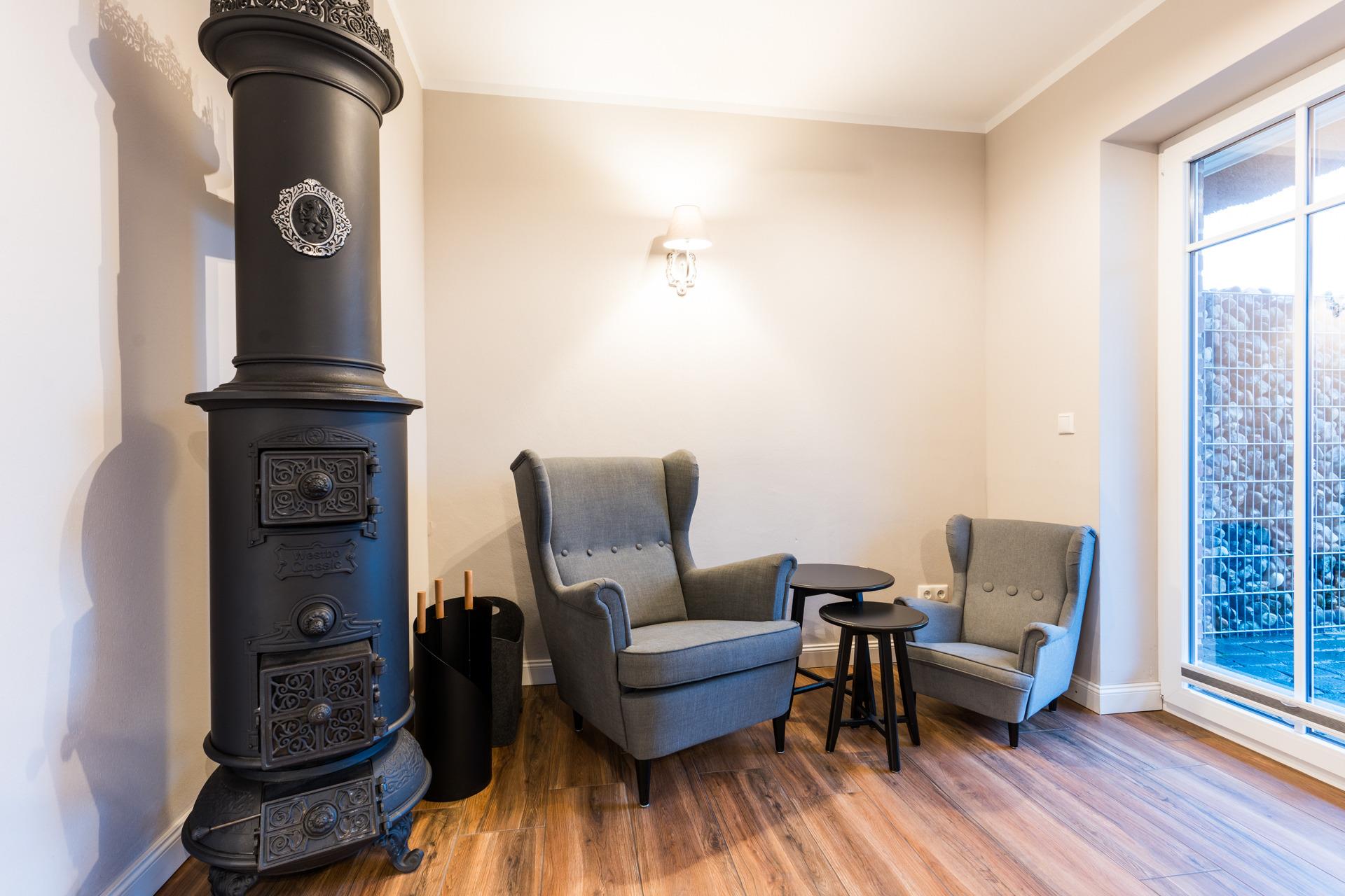 Im großzügigen Wohn-Esszimmer mit Kaminofen erwarten Sie ein Flachbid-TV mit DVD-Player, ein Radio und ein CD-Player.