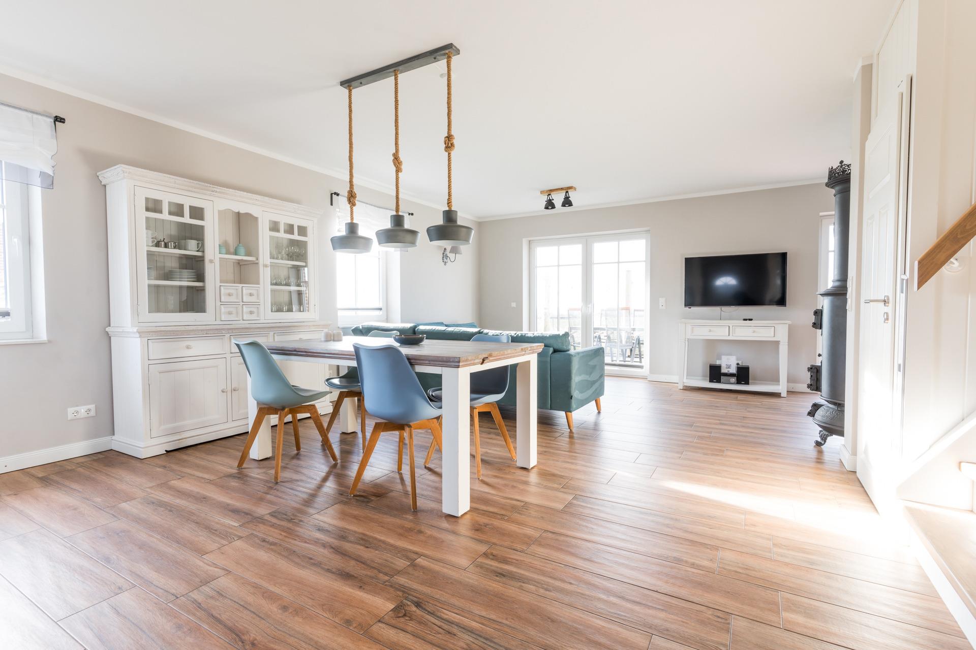 Im großzügigen Wohn-Esszimmer mit Kaminofen erwarten Sie ein Flachbid-TV mit DVD-Player, ein Radio und ein CD-Player.