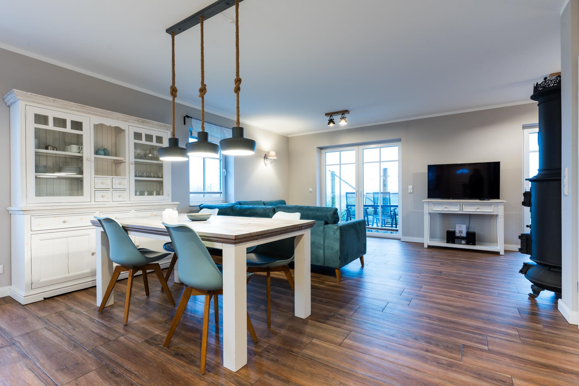 Im großzügigen Wohn-Esszimmer mit Kaminofen erwarten Sie ein Flachbid-TV mit DVD-Player, ein Radio und ein CD-Player.