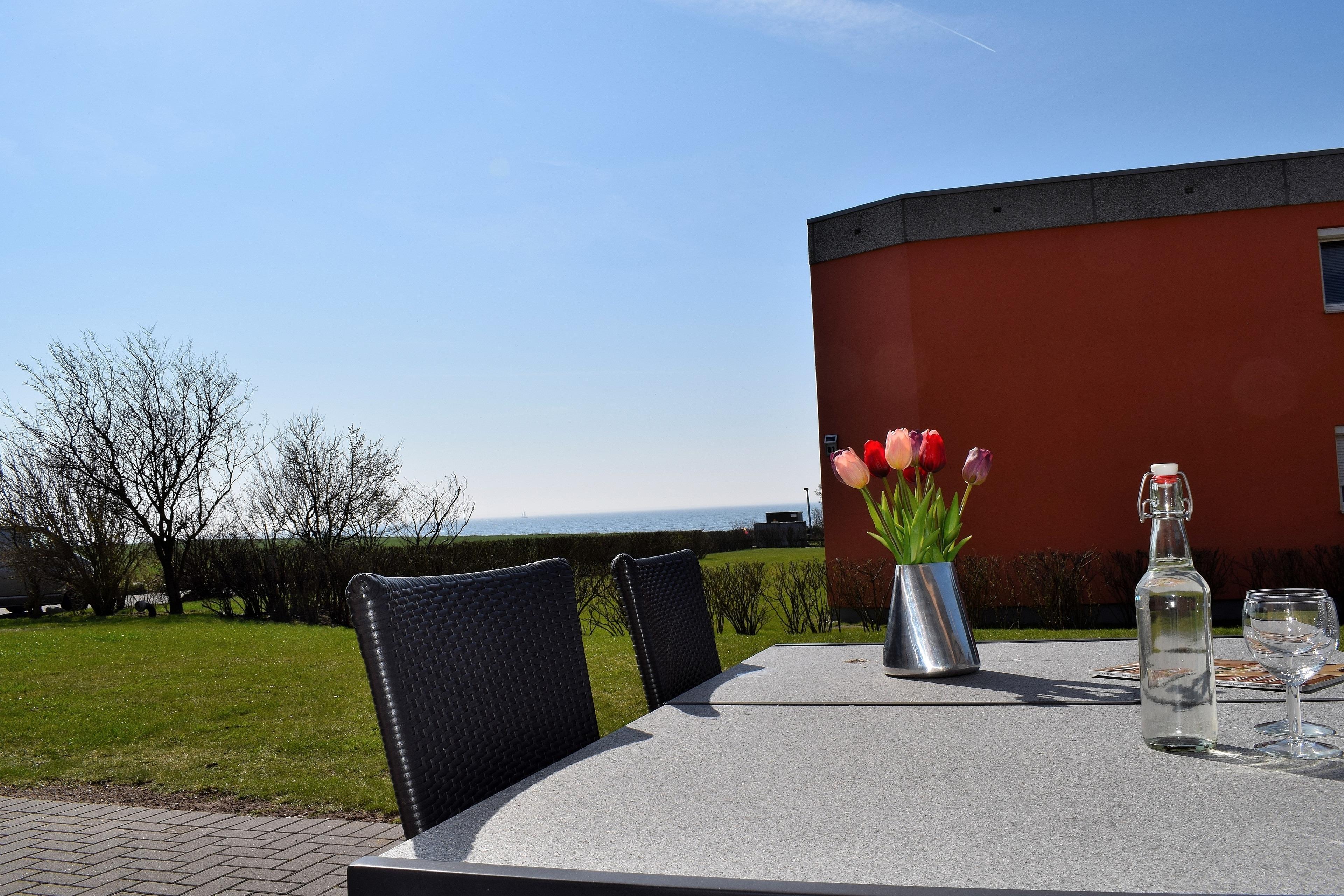 Genießen Sie den Meerblick vom möblierten Balkon aus oder entspannen Sie im Strandkorb direkt an der Düne.