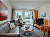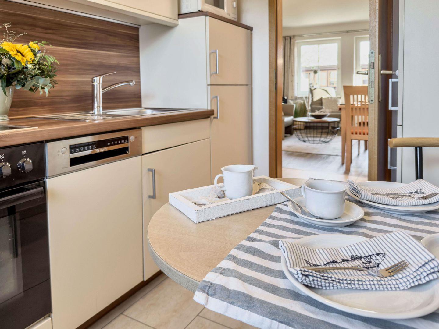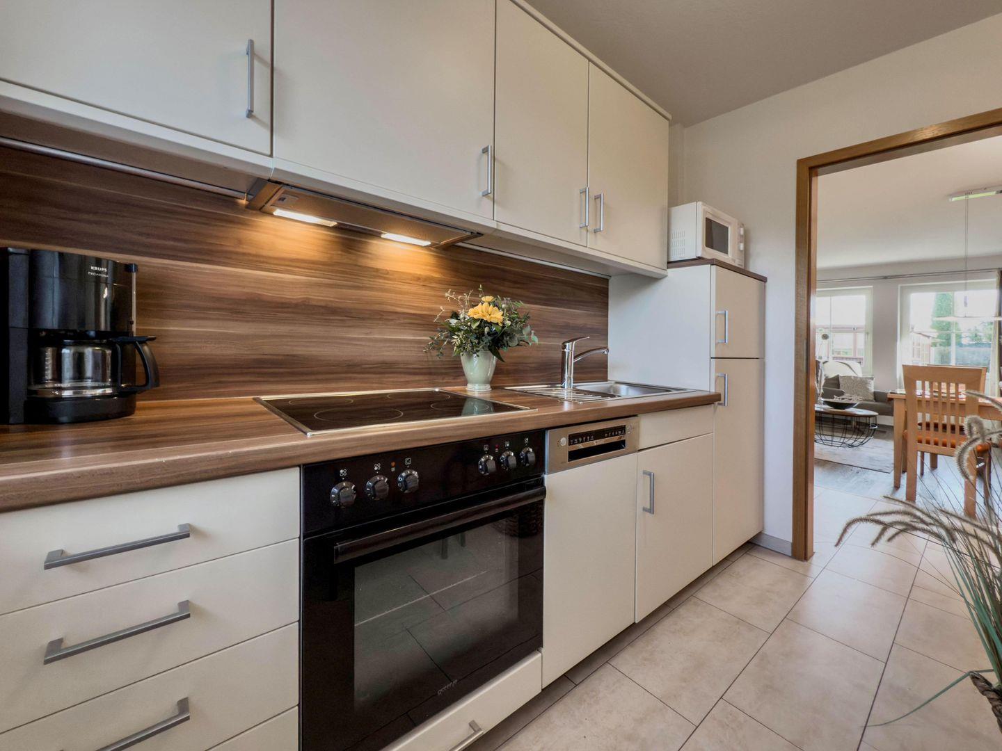 In dieser Wohnung finden Sie eine moderne und gleichzeitig gemütliche Atmosphäre vor. Die Fernsehecke ist mit Sofa, Sesseln und Couch eingerichtet. Der geräumige Küchenbereich ist mit allen notwendigen Küchenutensilien ausgestattet.