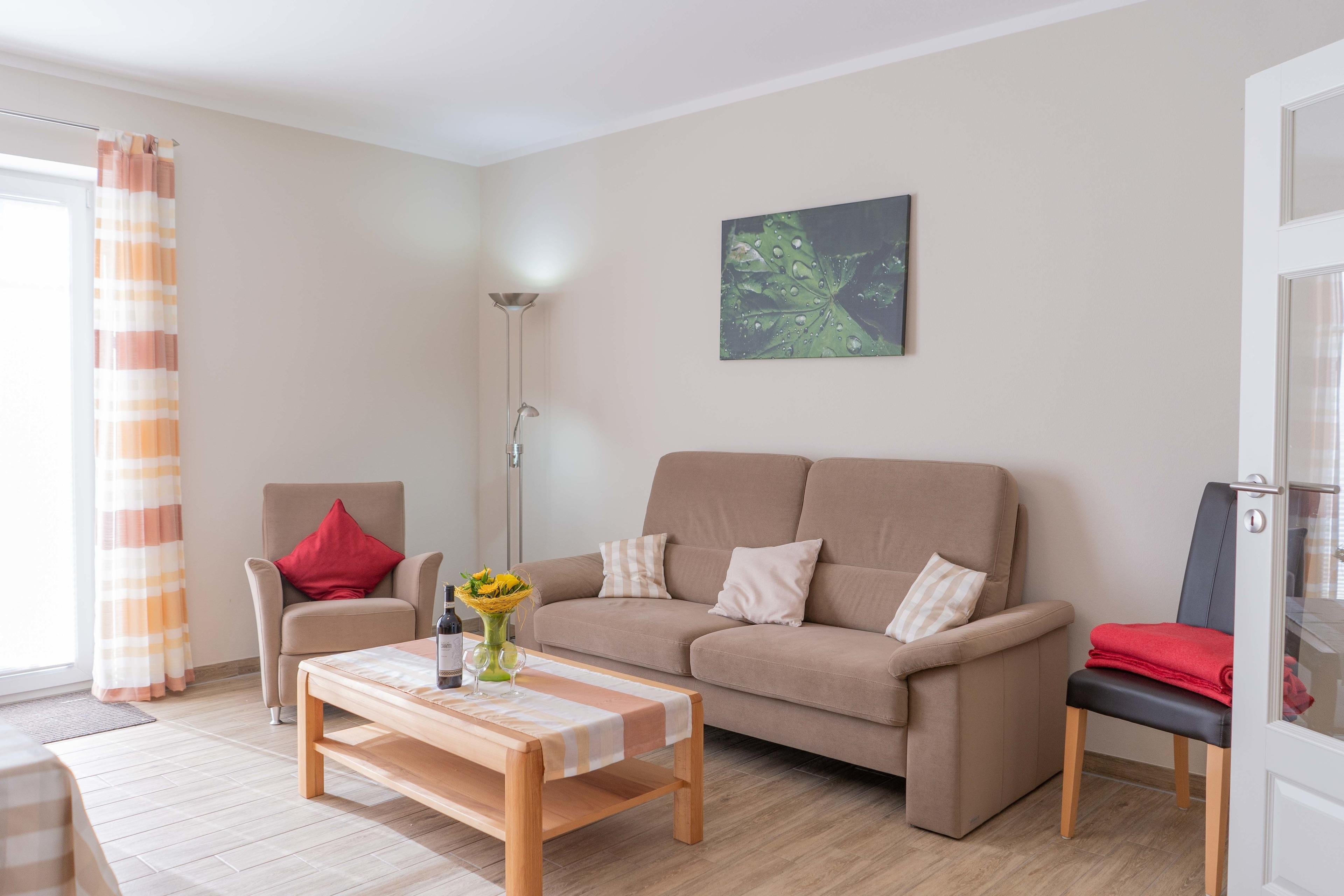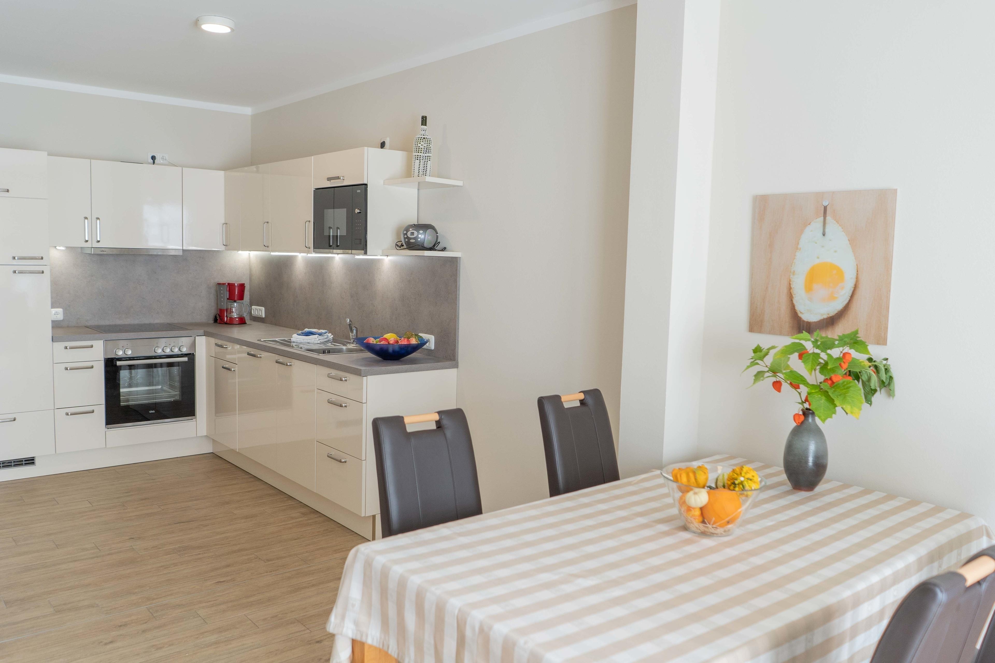 Wohnraum mit Sitzgruppe und Essplatz, WLan, Flachbildfernseher, direkter Zugang zur Südterrasse, voll ausgestattete Küche, Herd mit Ceran-Kochfeld und Backofen, Mikrowelle, Geschirrspüler, Tiefkühlfach, Kaffeemaschine, Wasserkocher, Toaster, Mixer usw.