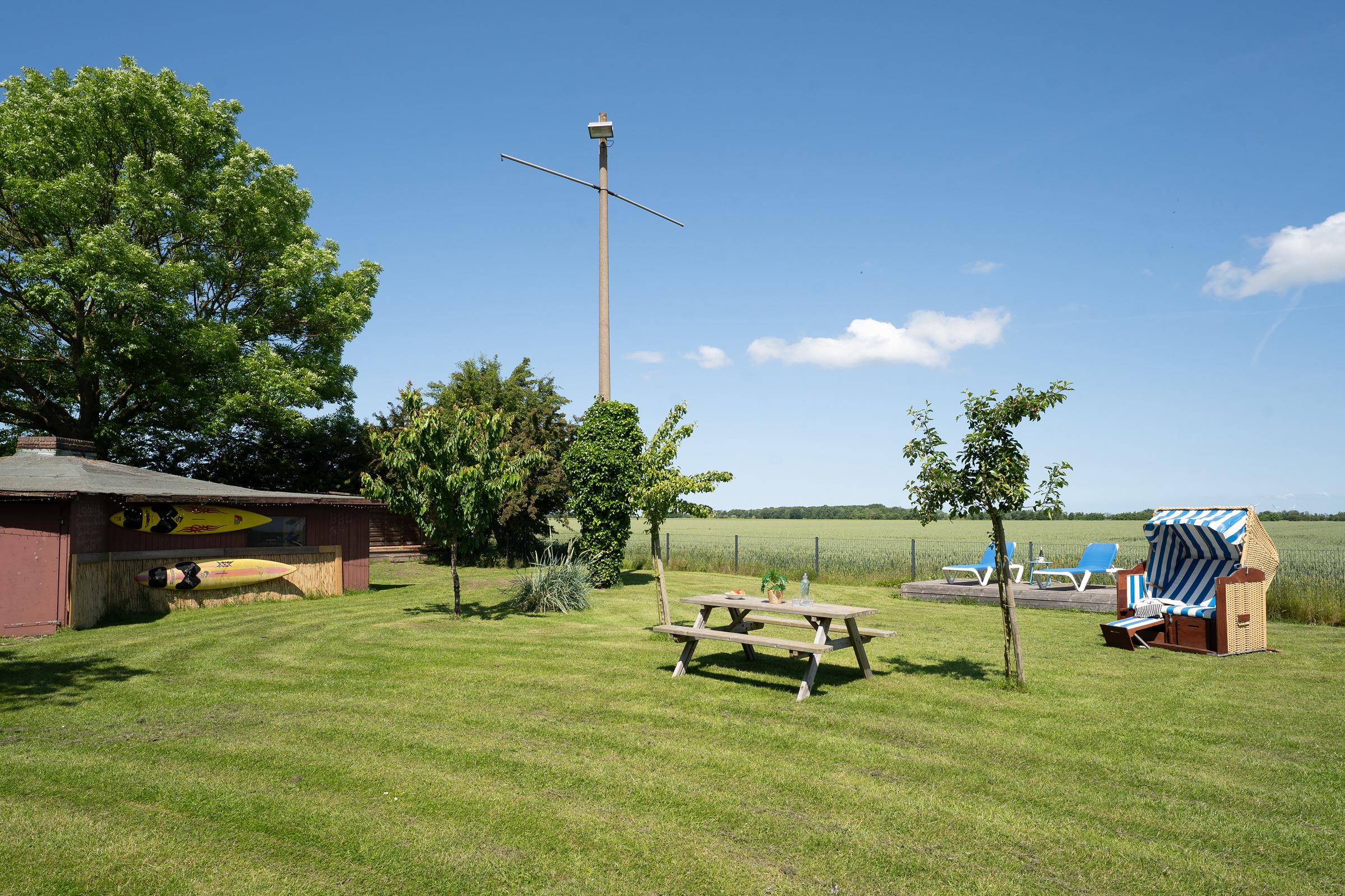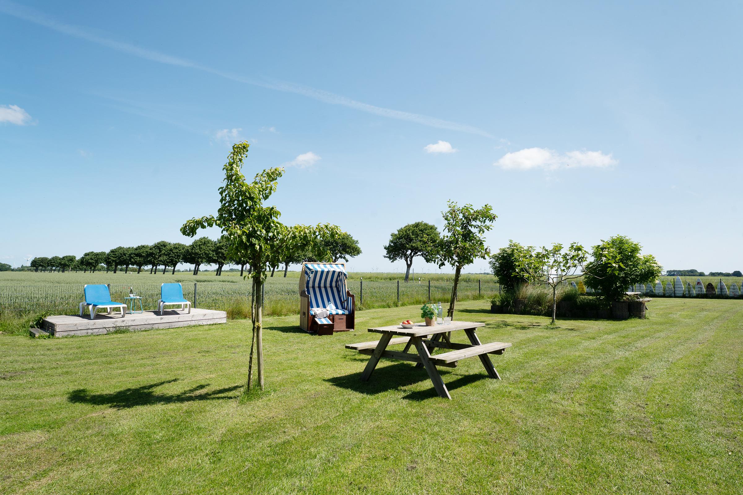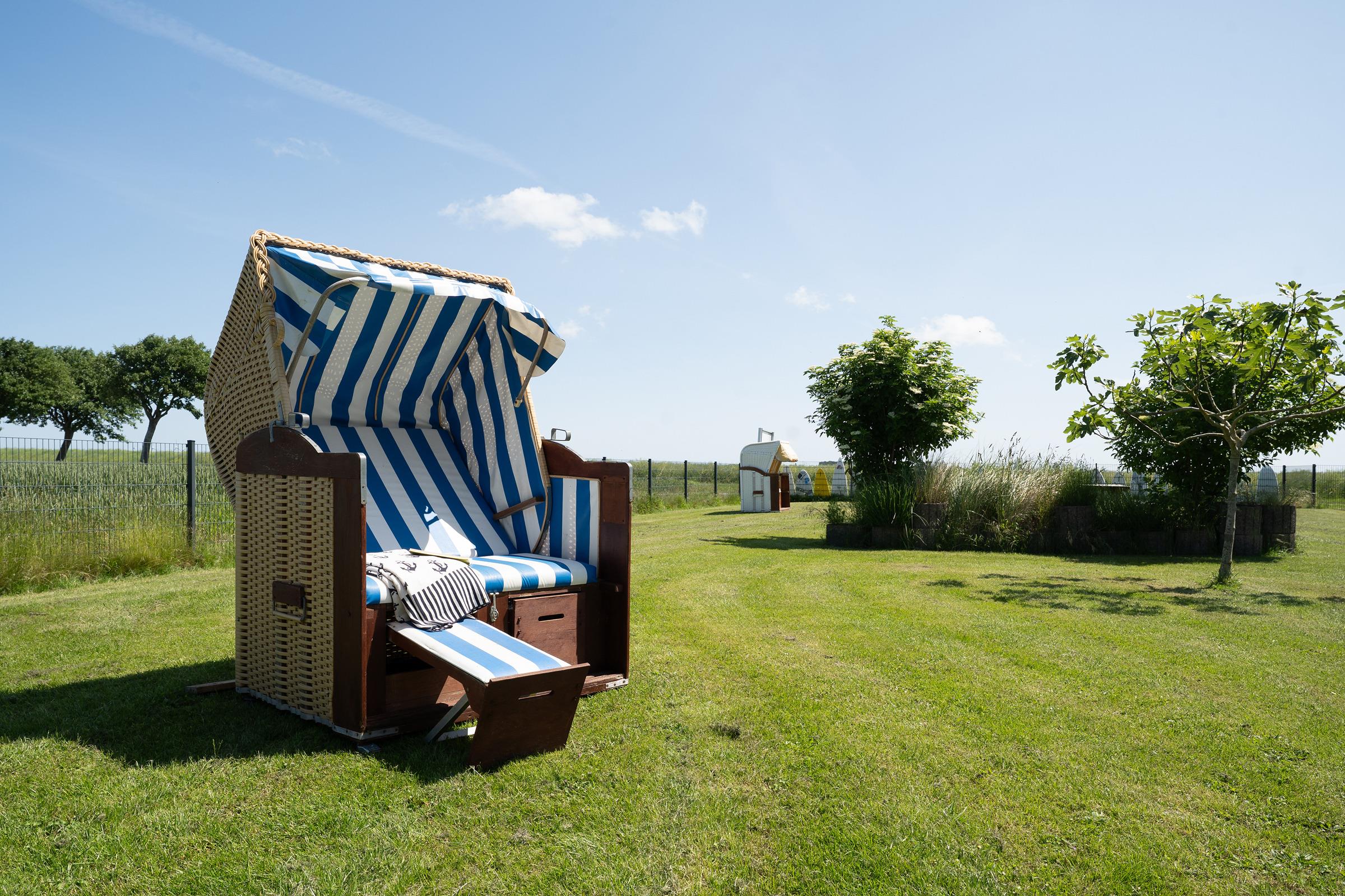 Der lichtdurchflutete Wohnbereich lädt mit einem Fernseher und komfortabler Sitzecke zum Entspannen ein. Direkt angrenzend befindet sich ein Gemeinschaftsgarten mit Gartenmöbeln, Sonnenliegen und einem Strandkorb– ideal für ruhige Stunden im Freien. Die Küchenzeile ist funktional ausgestattet mit Mikrowelle, Kaffeemaschine, Wasserkocher und Toaster – perfekt, um sich auch im Urlaub selbst zu versorgen. Der Essbereich bietet ausreichend Platz für gemeinsame Mahlzeiten. Im separaten Schlafzimmer mit Kleiderschrank steht ein bequemes Doppelbett (2x 90x200 cm) für erholsame Nächte bereit. Das moderne Badezimmer ist mit Dusche und WC ausgestattet.