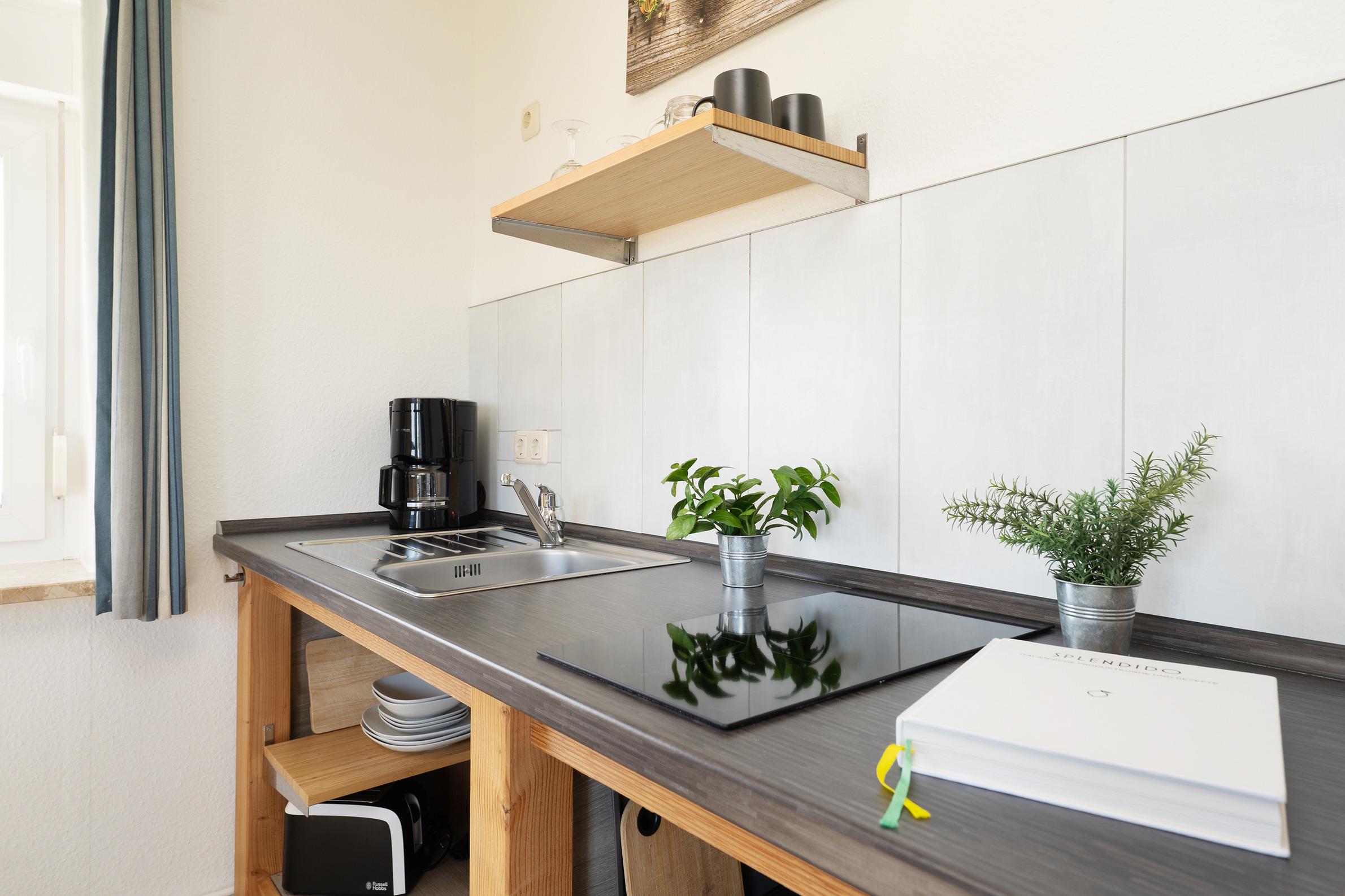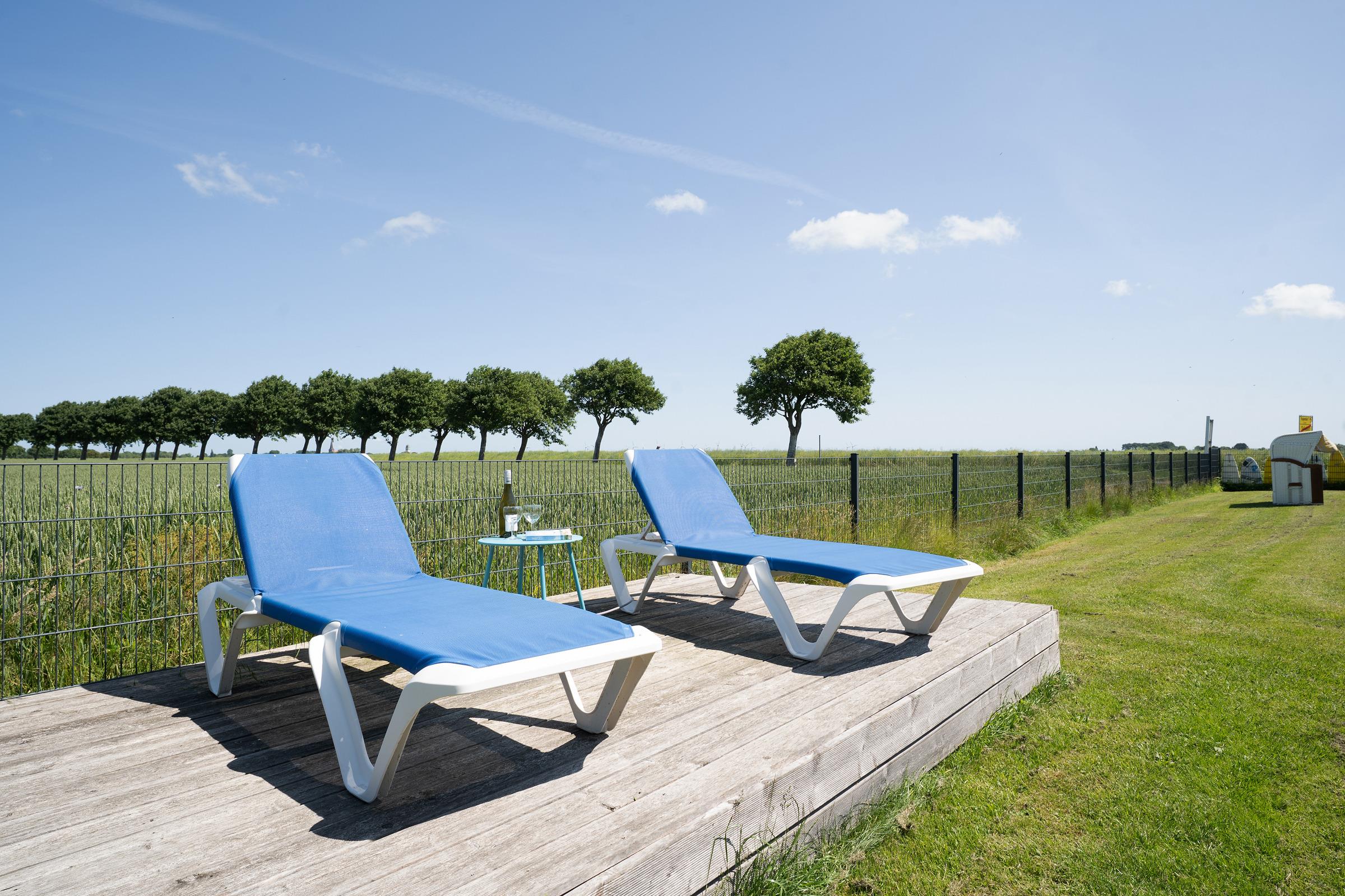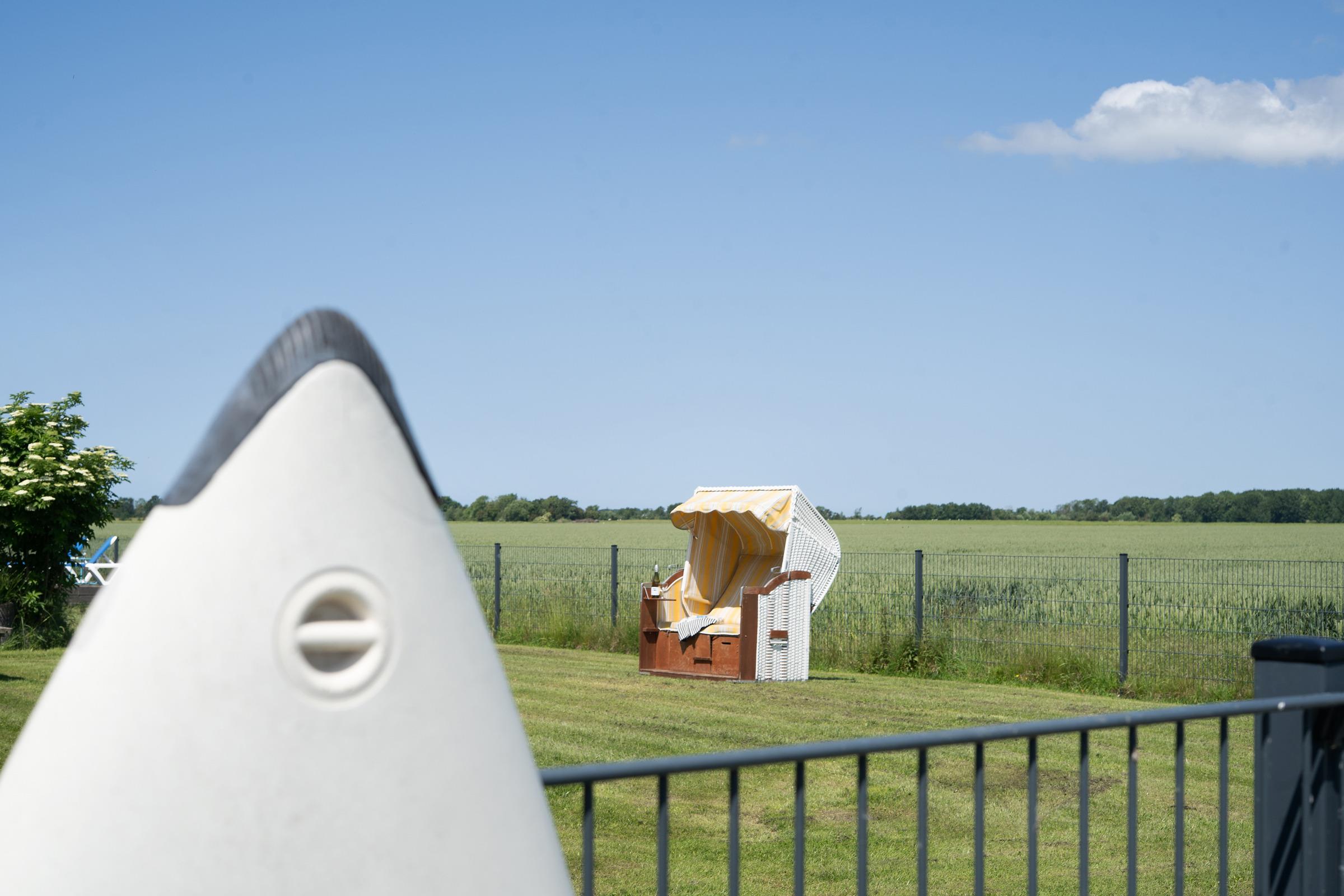 Der lichtdurchflutete Wohnbereich lädt mit einem Fernseher und komfortabler Sitzecke zum Entspannen ein. Direkt angrenzend befindet sich ein Gemeinschaftsgarten mit Gartenmöbeln, Sonnenliegen und einem Strandkorb– ideal für ruhige Stunden im Freien. Die Küchenzeile ist funktional ausgestattet mit Mikrowelle, Kaffeemaschine, Wasserkocher und Toaster – perfekt, um sich auch im Urlaub selbst zu versorgen. Der Essbereich bietet ausreichend Platz für gemeinsame Mahlzeiten. Im separaten Schlafzimmer mit Kleiderschrank steht ein bequemes Doppelbett (2x 90x200 cm) für erholsame Nächte bereit. Das moderne Badezimmer ist mit Dusche und WC ausgestattet.