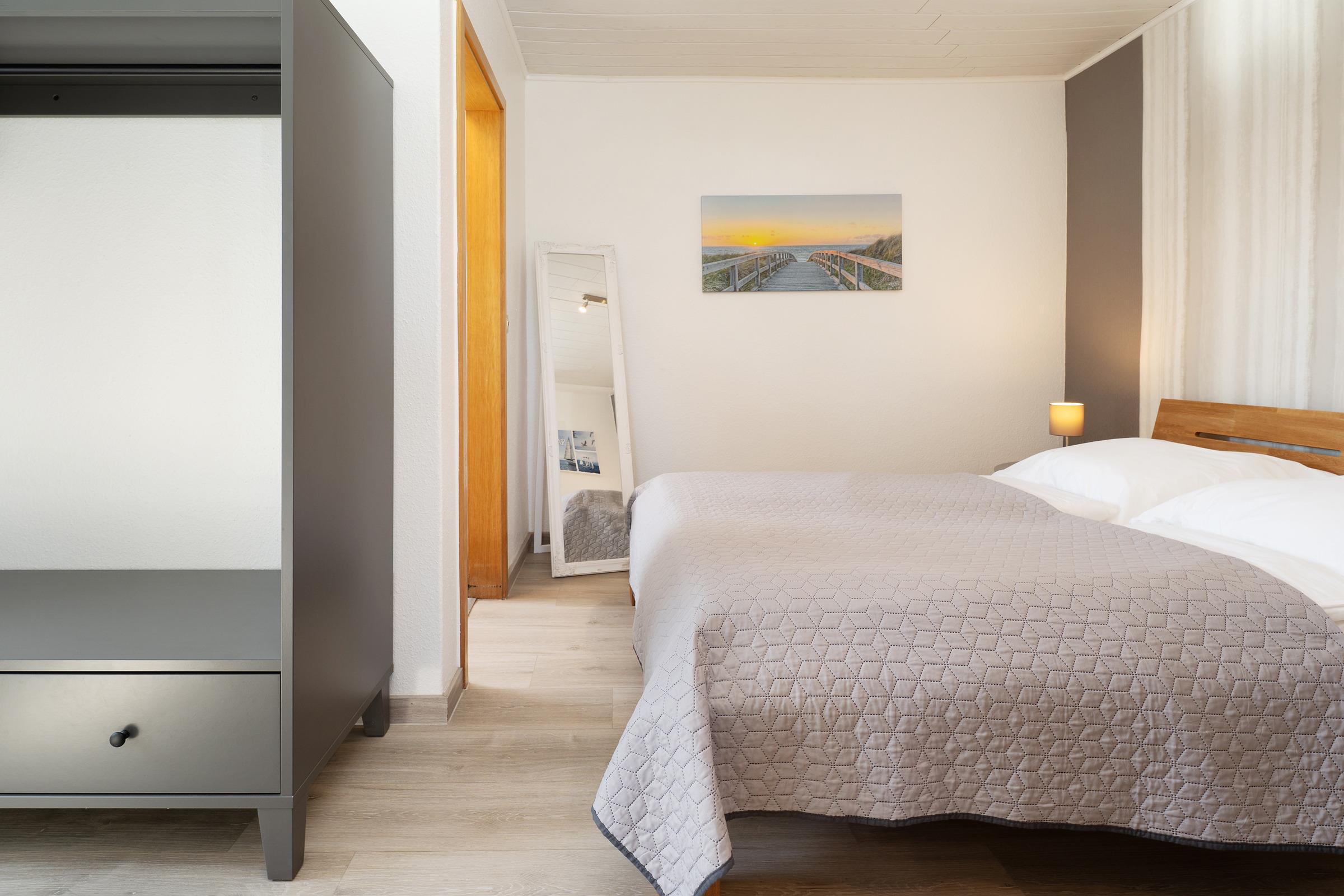 Schlafzimmer: 1 Doppelbett (2x 90x200 cm), Kleiderschrank, Verdunkelung: Außenjalousie, Platz für ein Babybett