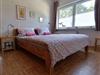 Der angrenzende Schlafraum umfasst ein Doppelbett, Nachttische mit Lampe und einen Kleiderschrank.