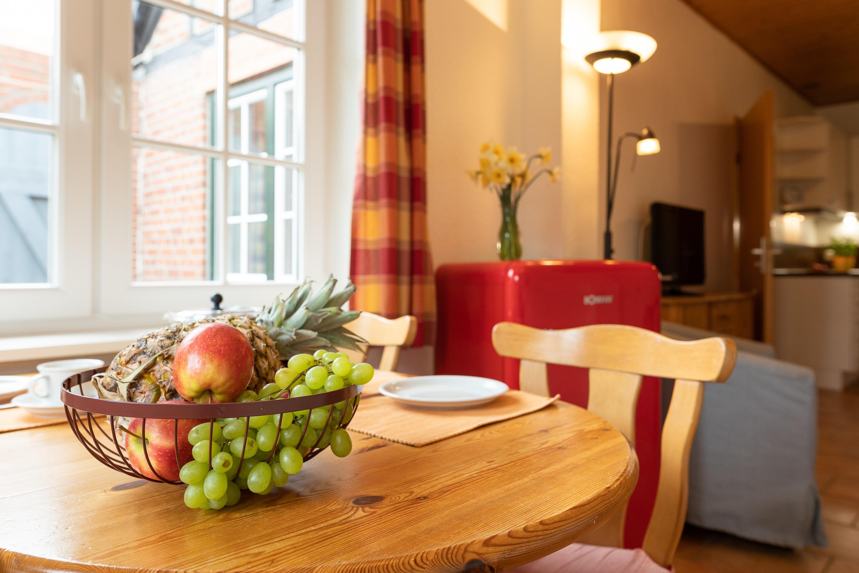 Unsere Ferienwohnung "Strandkorb"befindet sich im Bauernhaus mit seperatem Eingang. Sie bietet mit 60 m² und einer Terrasse Platz für 4 Personen.