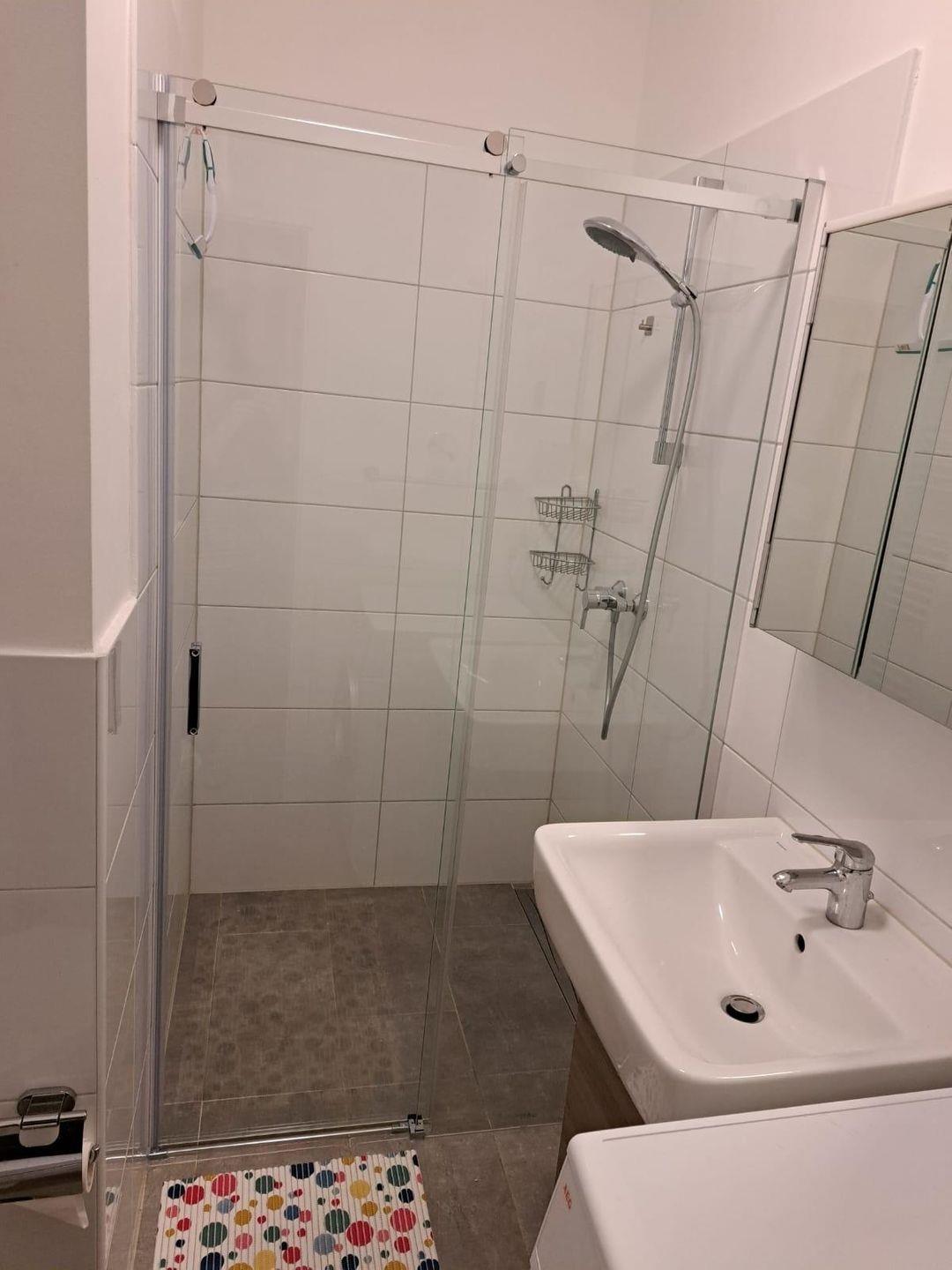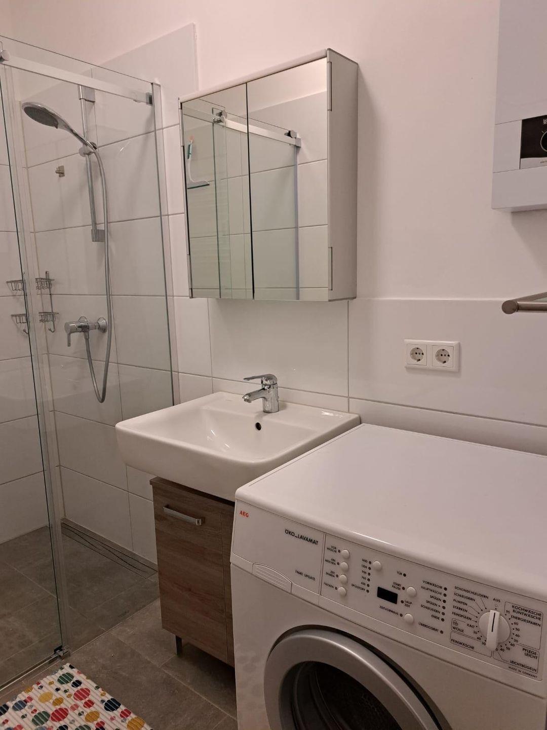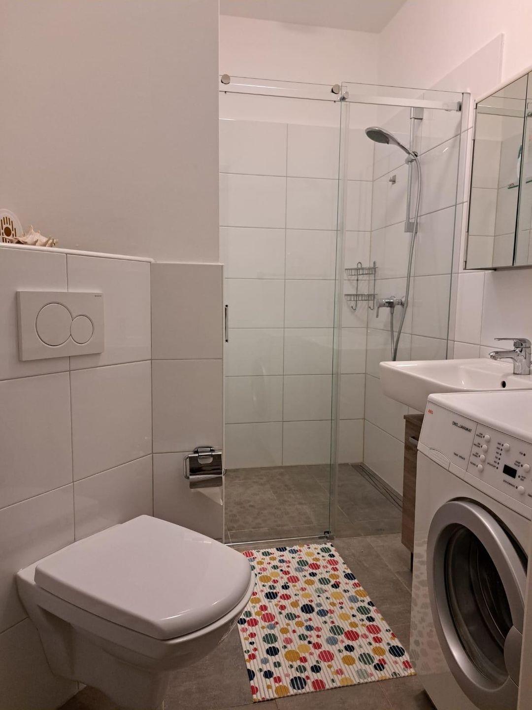 Das Bad hat eine ebenerdige Dusche, dort befindet sich auch eine