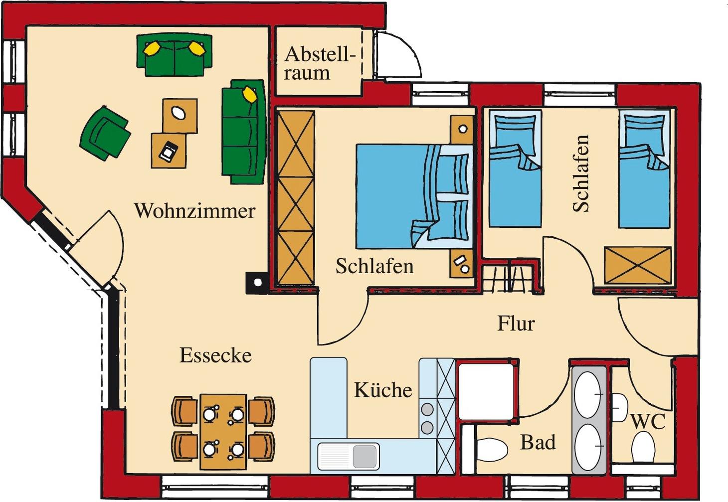 hat eine Größe von 70qm. Der großzügige Wohnbereich mit gemütlicher Sitzecke, Kamin und Essecke lädt zu gemütlichen Stunden ein. Die offene Küchenzeile lässt das Kochen im Urlaub zum Familienerlebnis werden. Natürlich ist die Küche komplett ausgestattet mit Geschirrspüler, Mikrowelle, Backofen etc. Ein Schlafzimmer verfügt über Doppelbetten, im anderen befinden sich zwei Einzelbetten.