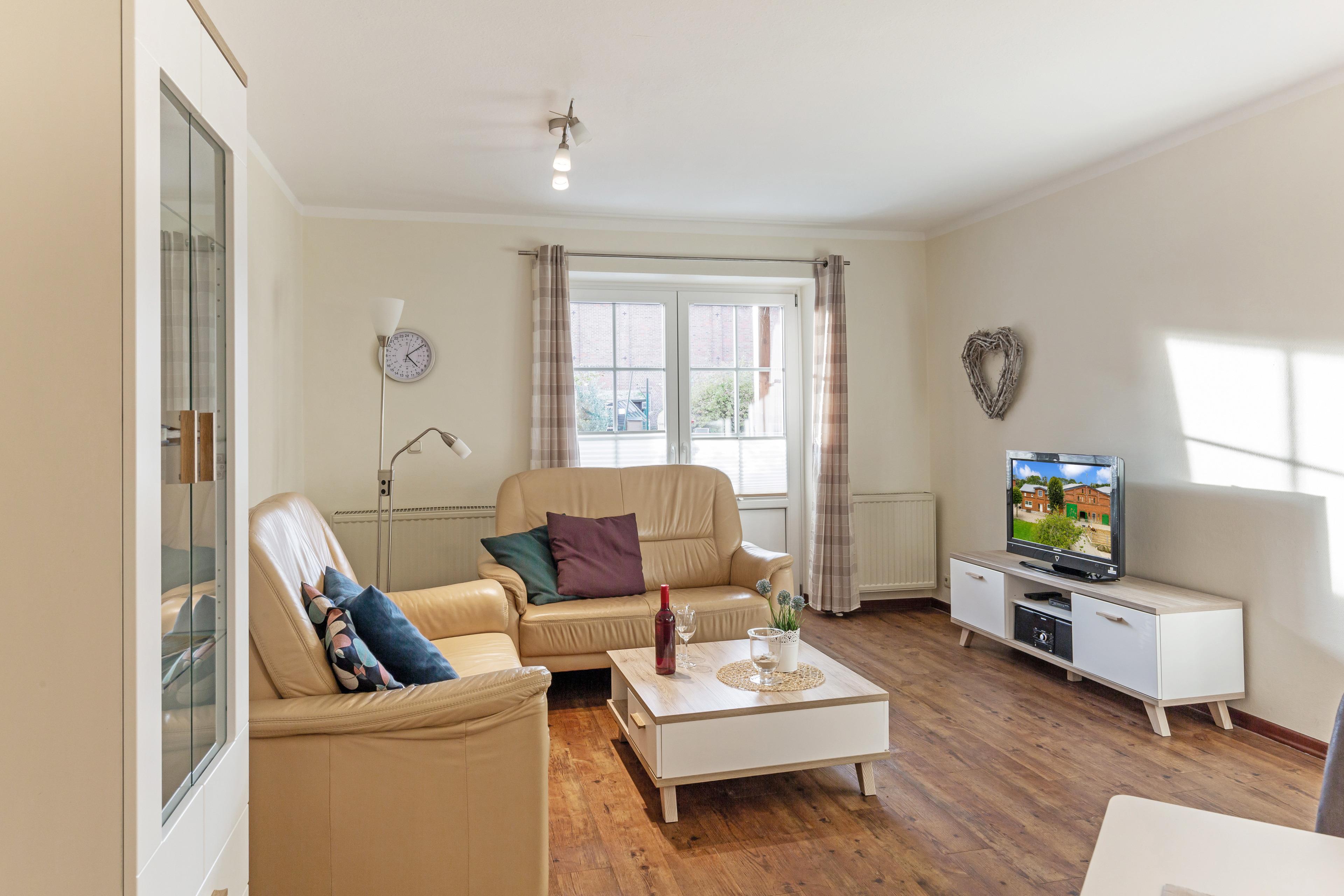 Im Wohnraum befindet sich ein Sofa, TV-Schrank (Sat-TV,CD/DVD-Spieler) und ein Essplatz. Über die Terrasse hat man Zugang zum Garten. Zusätzliche Sitzecken mit Strandkörben im Garten sind vorhanden.