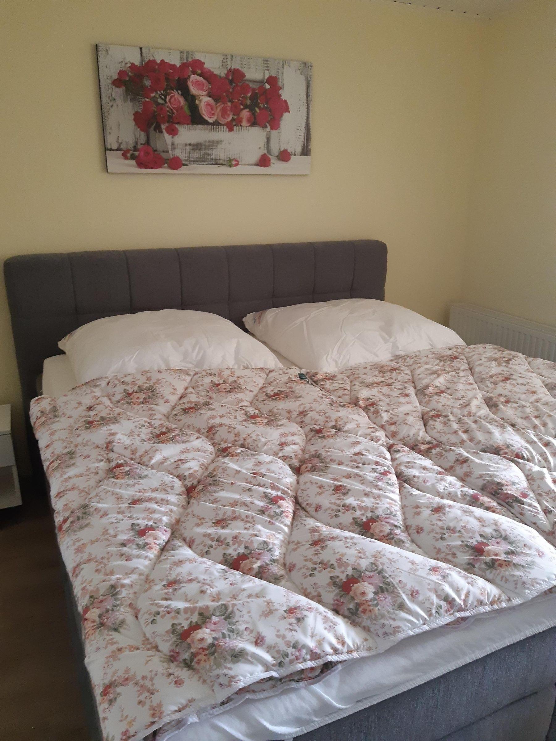 Schlafzimmer: Doppelbett, TV, Kommode.