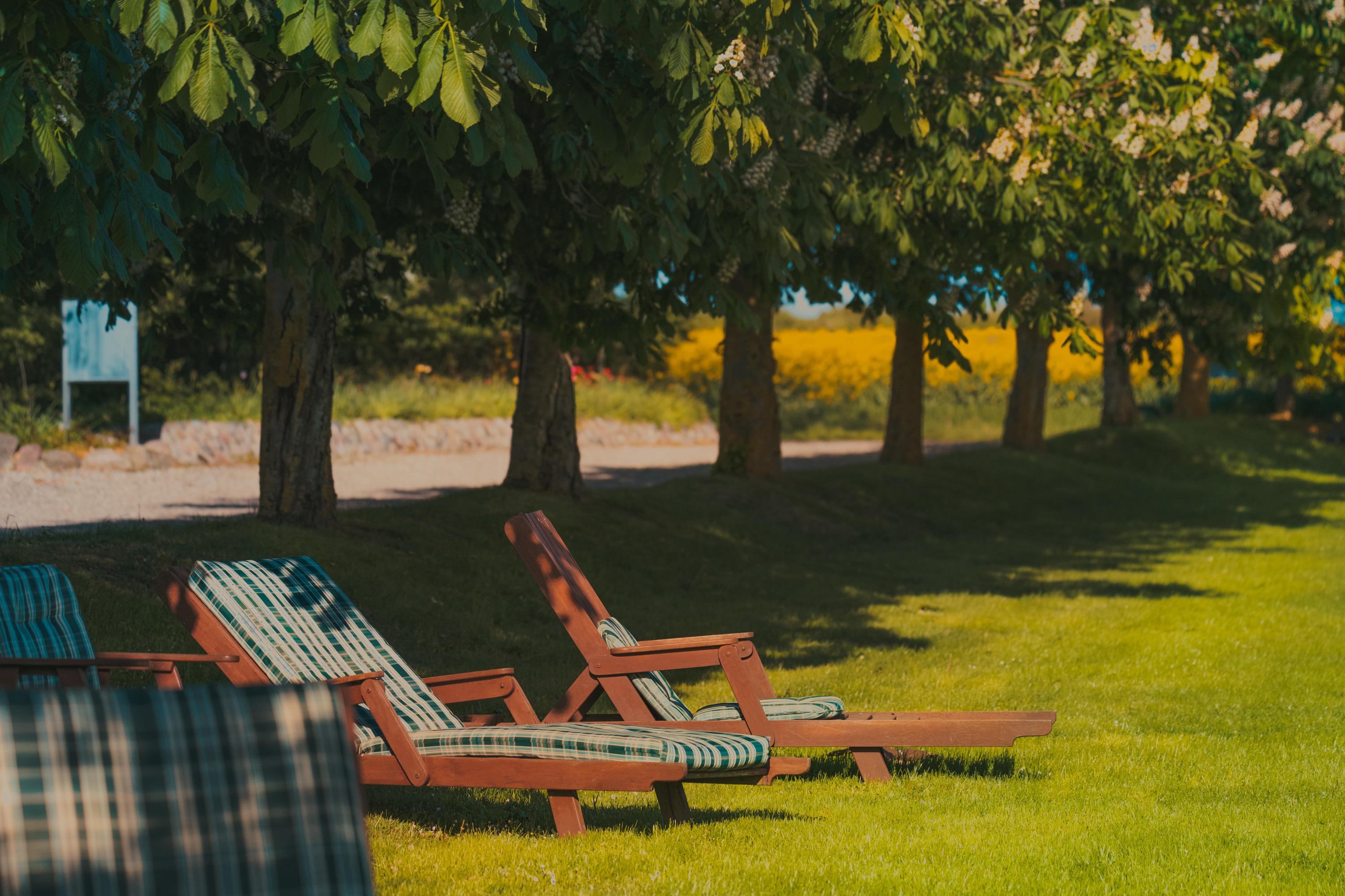Strandkörbe, Sitzgruppen und Liegen im weitläufigen Garten bieten Rückzugsmöglichkeiten sowie auch ein geselliges Beisammensein.