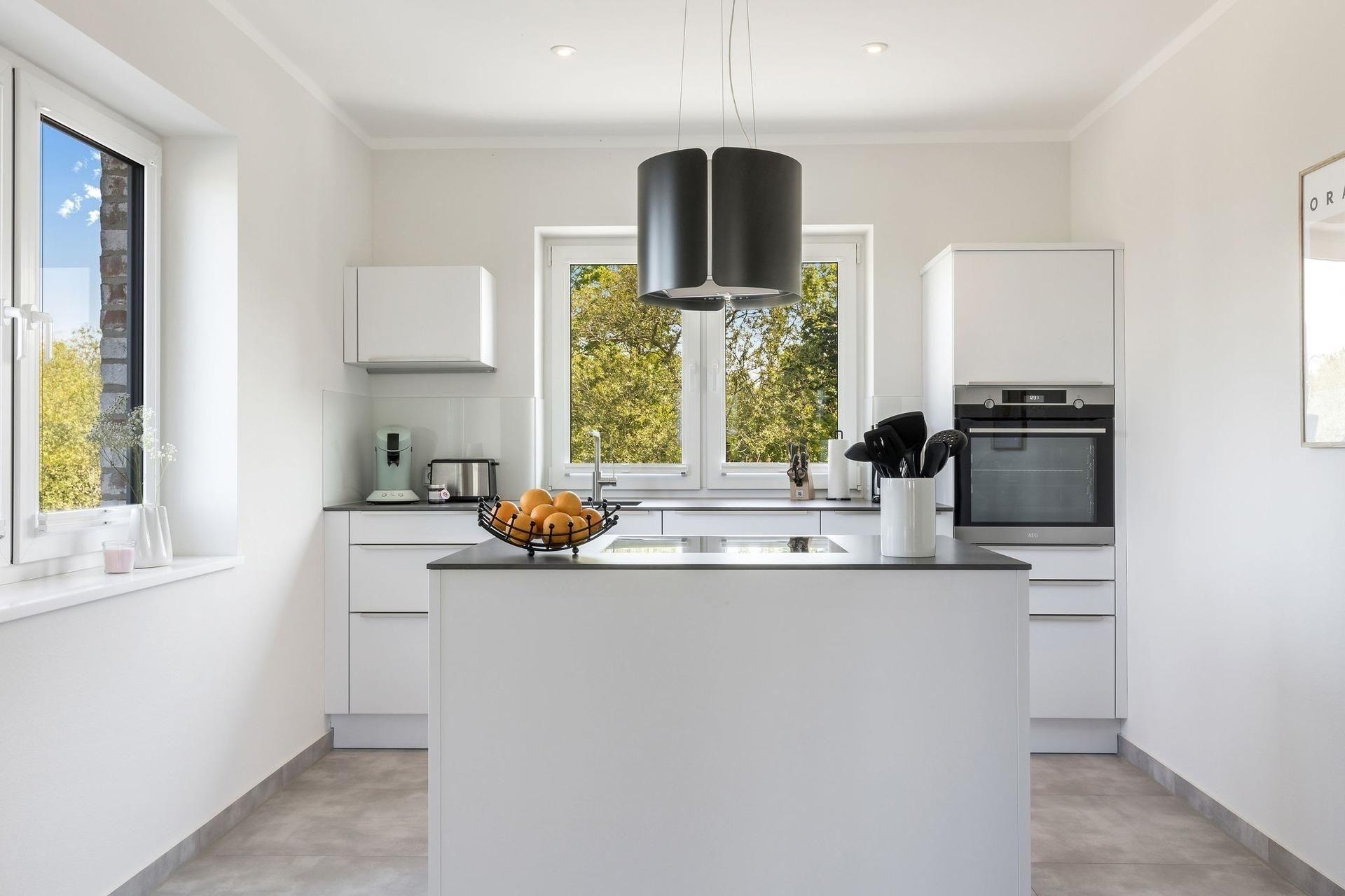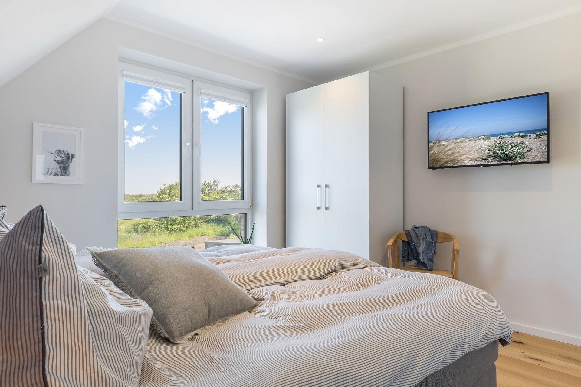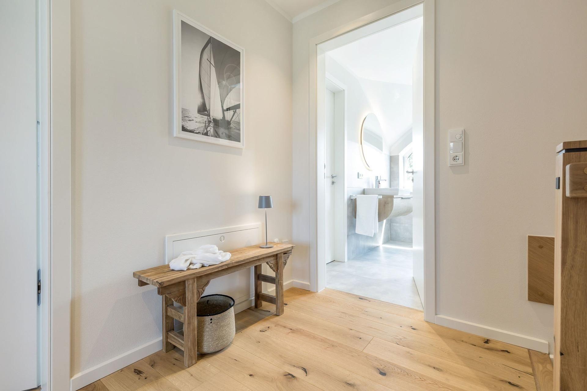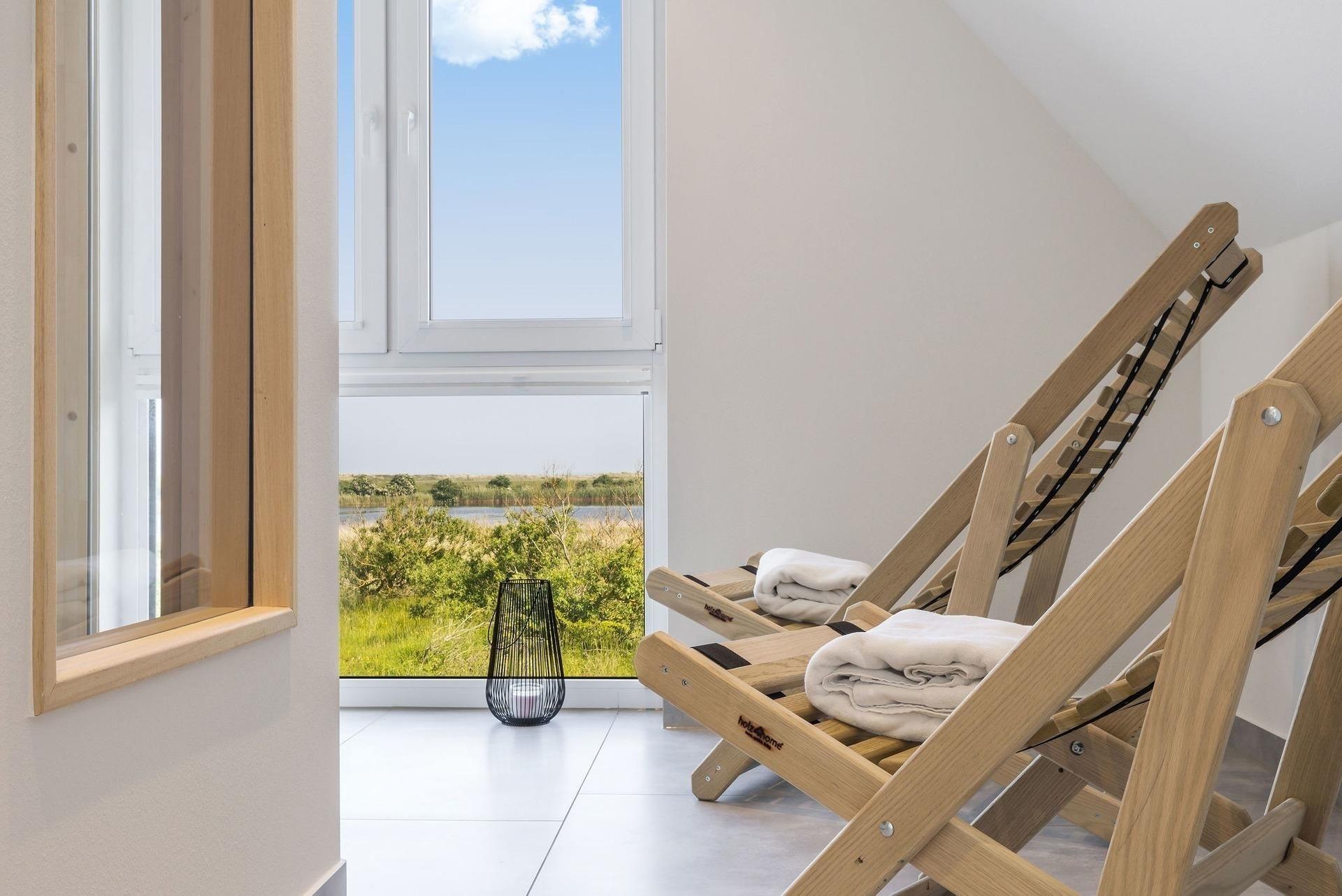 Die hochwertige, moderne Ausstattung lässt keine Wünsche offen. Das großzügige Wohnzimmer mit Wohnküche und Kamin lädt zu gemütlichen Abenden ein, während die traumhafte Lesenische der perfekte Ort für entspannte Stunden mit einem guten Buch ist. Die Küche ist ein wahres Paradies für Hobbyköche, ausgestattet mit vielen Küchengeräten und einer modernen Kochinsel, die sich ideal für gesellige Kochabende eignet. Die beiden separaten Schlafzimmer sind mit komfortablen Boxspringbetten ausgestattet, die für erholsamen Schlaf sorgen. Zwei luxuriöse Badezimmer stehen Ihnen zur Verfügung: eines mit Dusche und WC, das andere mit einer ebenerdigen Regendusche, einem großen Waschbecken und einer Badewanne. Zu den weiteren Annehmlichkeiten zählen eine automatische Treppenbeleuchtung an den Stufen und eine Fußbodenheizung, die in der kühleren Jahreszeit für wohlige Wärme sorgt.