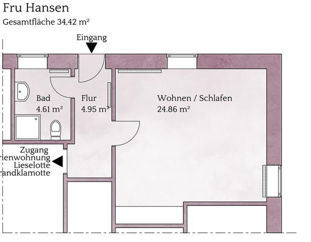Unsere Fru Hansen ist ein charmantes 1-Raum-Apartement mit Küchenzeile und Duschbad. Es bietet Platz für zwei Personen. Auf Anfrage können wir einen Durchgang zur Ferienwohnung Lieselotte Strandklamotte ermöglichen.