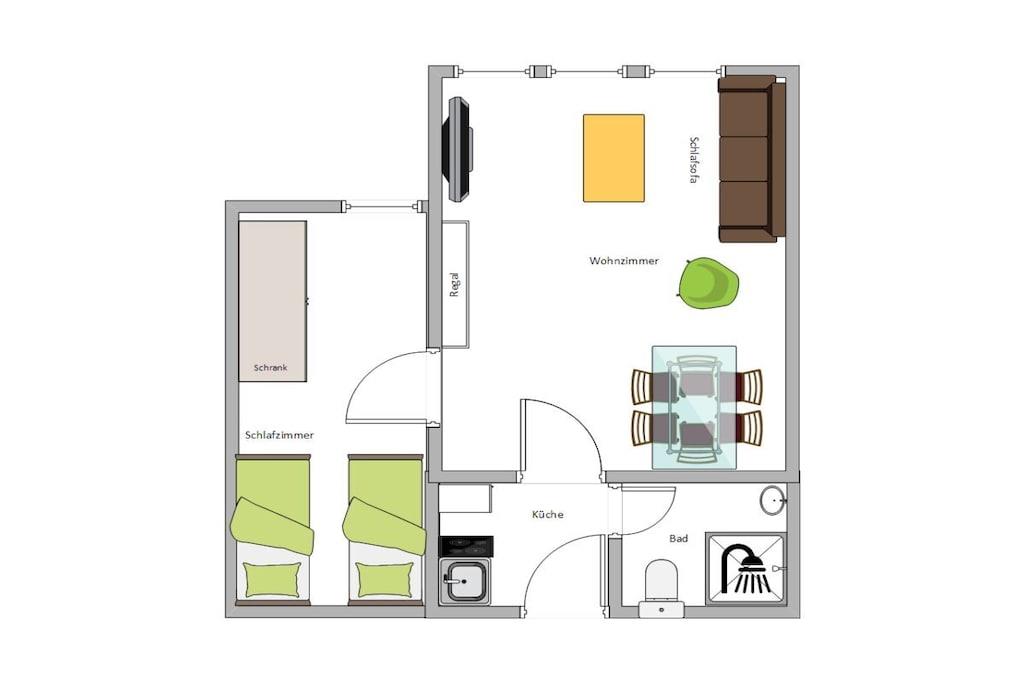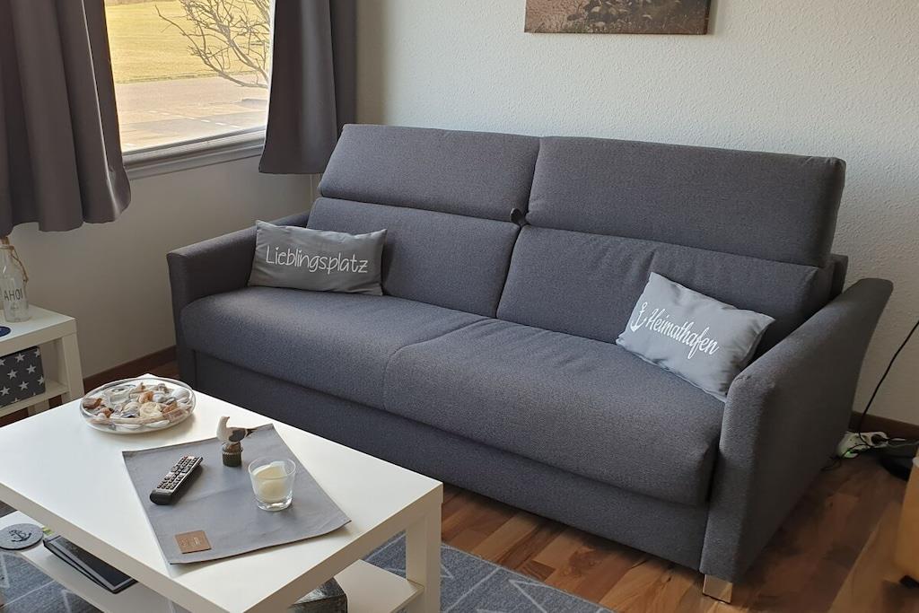 Vores moderne møblerede ferielejlighed tilbyder alt, hvad både par og børnefamilier har brug for til en dejlig ferie. Opholdsstuen med elektrisk pejs har en komfortabel sovesofa, et spisebord til fire personer og et 55" LED-tv (satellit-tv), internetradio og Wi-Fi (50 Mbps). Det tilstødende soveværelse har to enkeltsenge med boxmadras, som også kan skubbes sammen til en dobbeltseng, og et rummeligt klædeskab. Køkkenet er udstyret med induktionskogeplade, mikrobølgeovn, køleskab, kaffemaskine, elkedel og brødrister. Sengelinned, håndklæder og en barneseng kan medbringes mod et ekstra gebyr. En højstol er tilgængelig.